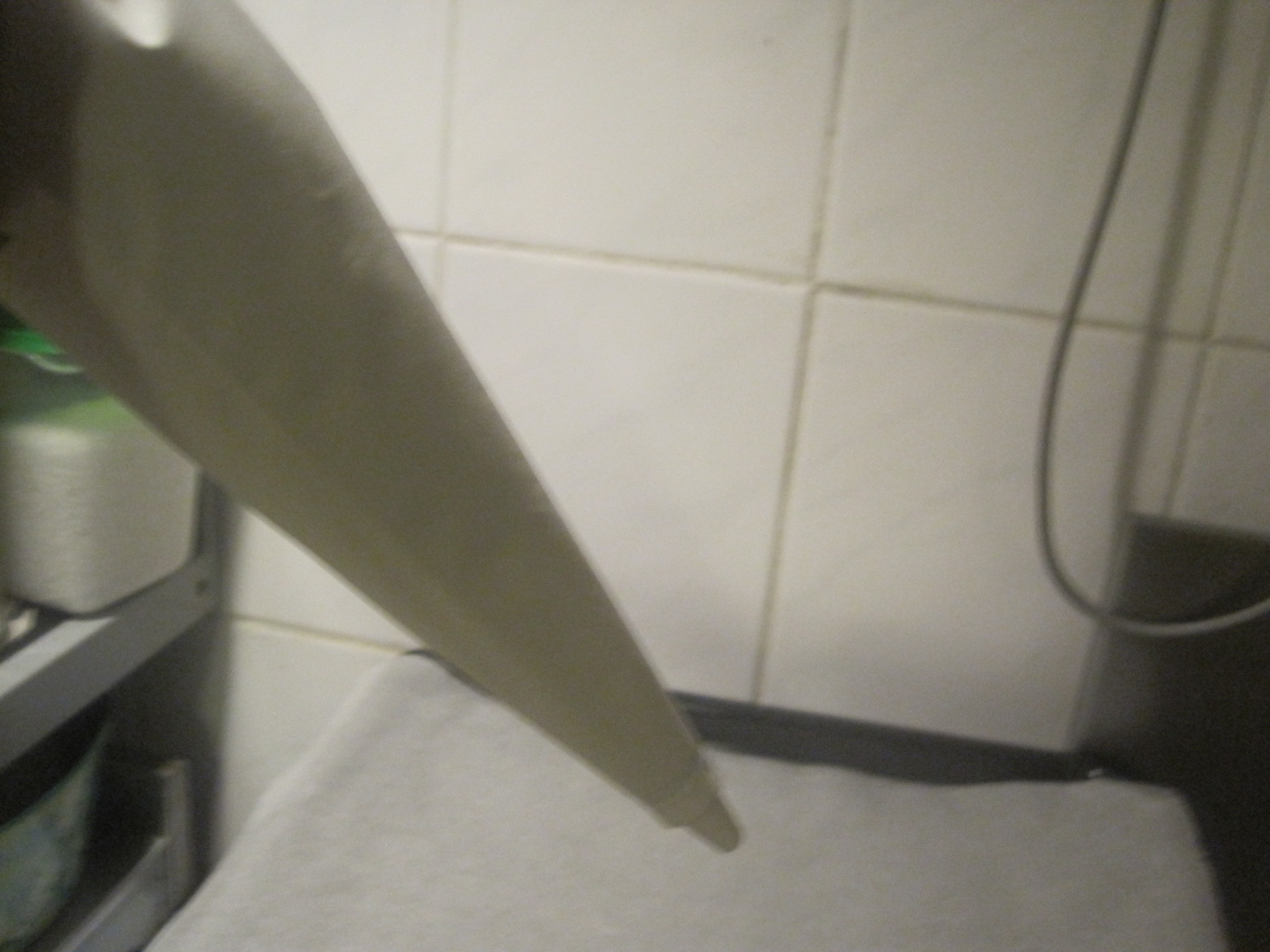 Kartoffelteig in die Spritztüte einfüllen, am hinteren Ende zusammendrehen, damit der Kartoffelteig nicht oben heraus quillt und so gibt man auch Druck auf die Tüte.