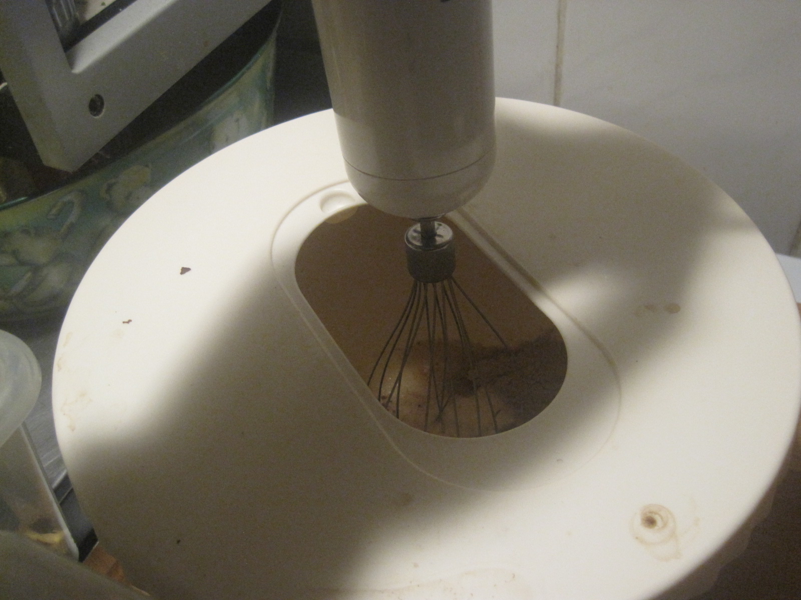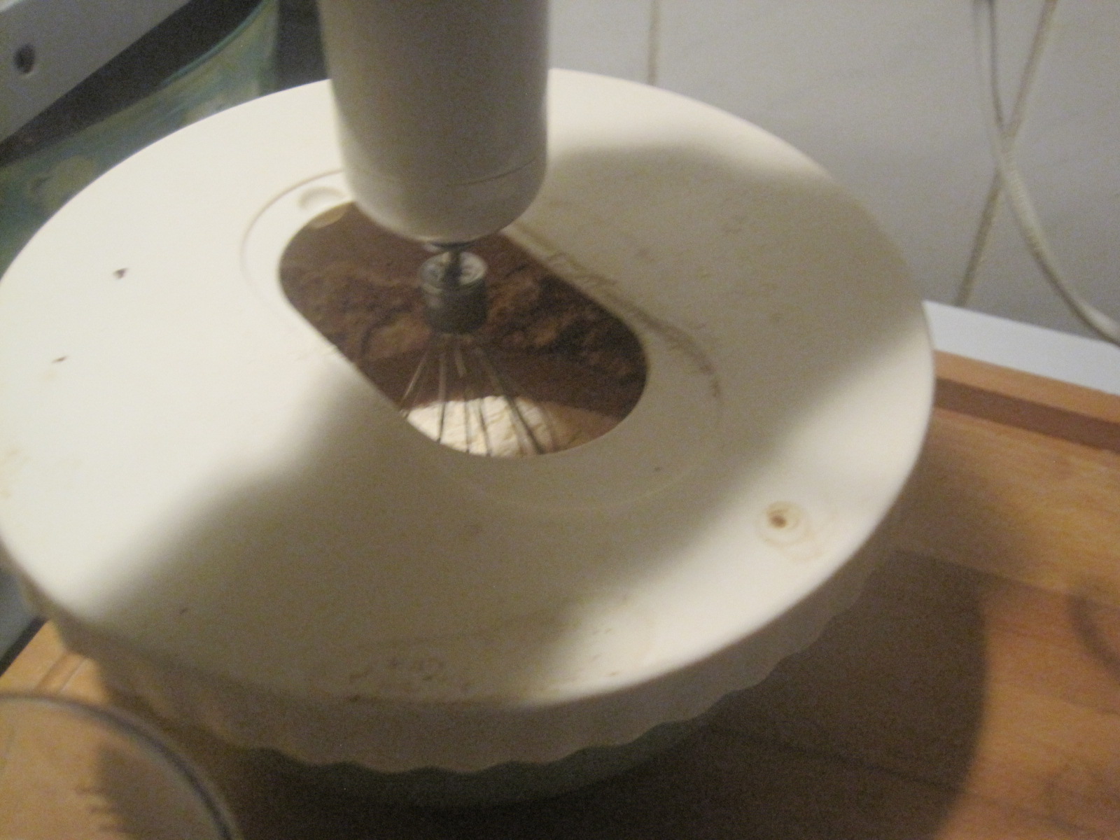 Damit das nicht so spritzt, hat mir meine Frau so eine Angeberrührschüssel von Ikea mitgebracht, die man mit einem Deckel schließen kann und dann nur noch ein Loch für den Rührer hat. Sehr praktisch.