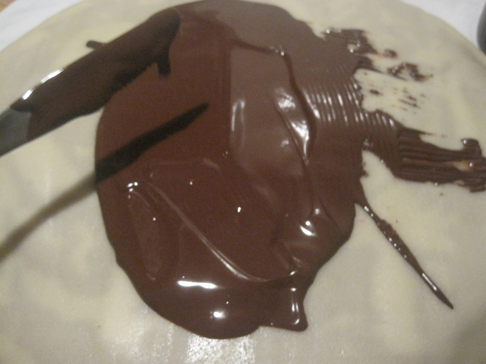 Kuvertüre auf dem Kuchen verteilen und dann mit einem Messer verstreichen.