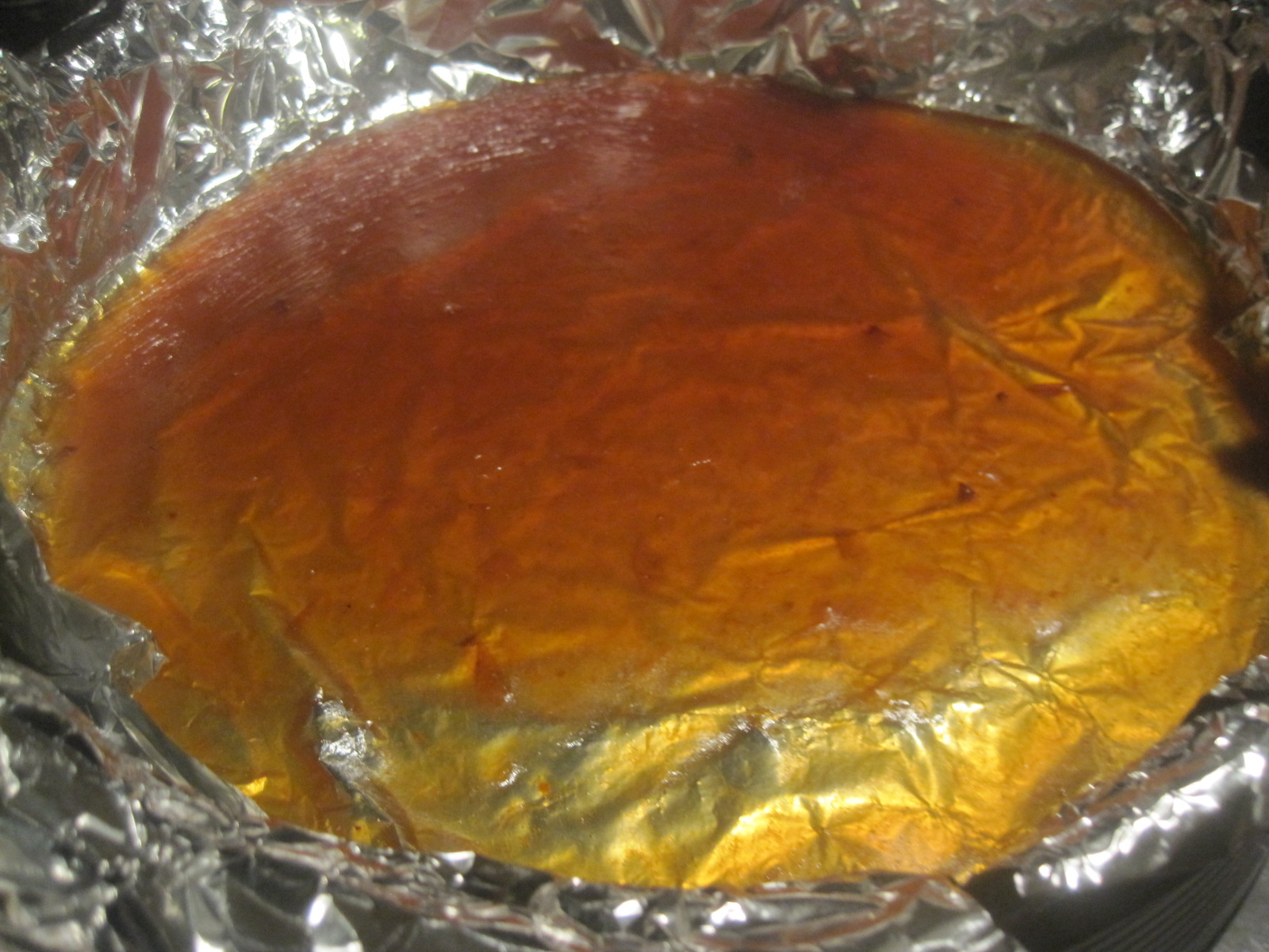 Die Marmelade auf die Alufolie kippen und gleichmäßig verteilen. Dann hart werden lassen. Ich habe die von draußen auf die Fensterbank gestellt und wie immer wenn ich etwas mache, war es auch schon wieder sackspät, irgendwann weit nach Mitternacht.