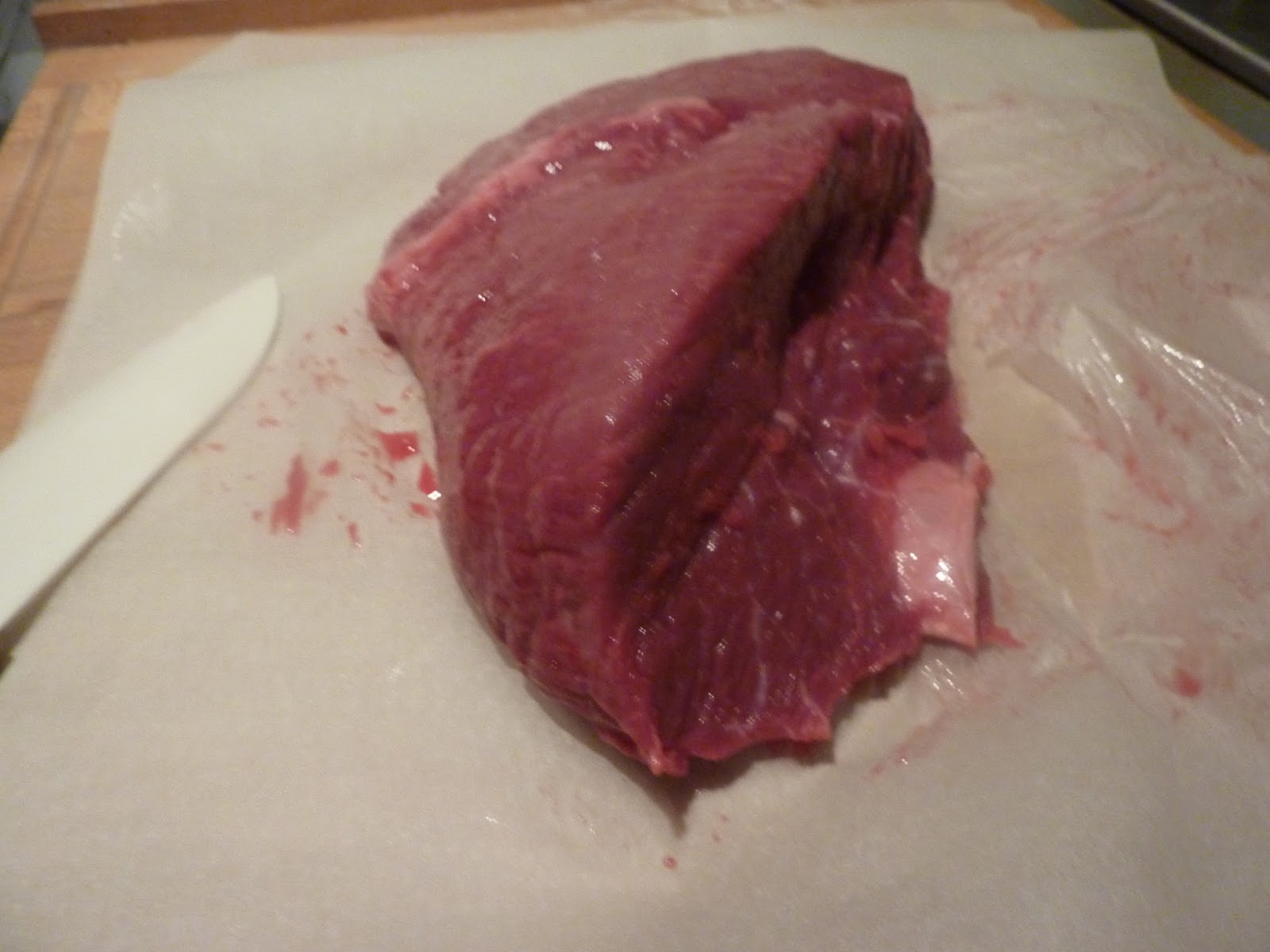 Das sind 2,6 Kilo Rinderhüfte, Preis als Restposten 5 Euro das Kilo plus Mehrwersteuer. Besser als wenn man sich sonst zu dem Preis ein Kilo Rinderhack kaufen würde, oder? So richtig fiese Genbukkake aus 60 Rindern pro 500 Gramm Hackfleisch. Sogar meine Frau lacht mich aus und sagt, das hättest Du Dir doch denken können, dass die beim Hackfleisch nicht nur Fleisch von einer Kuh wolfen. In meiner romantischen Vorstellung von Fleisch ist das halt so.