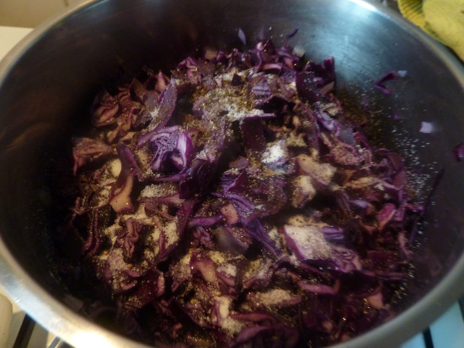 Rotkohl in den Topf geben, wenn die Zwiebeln ein wenig Farbe bekommen haben.