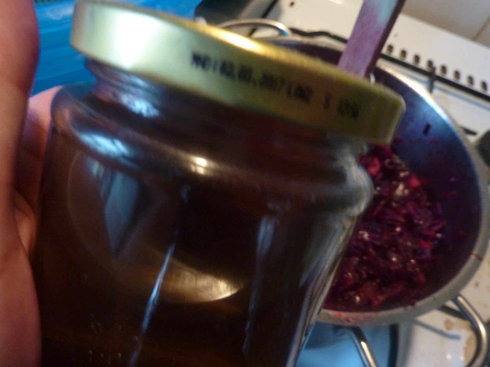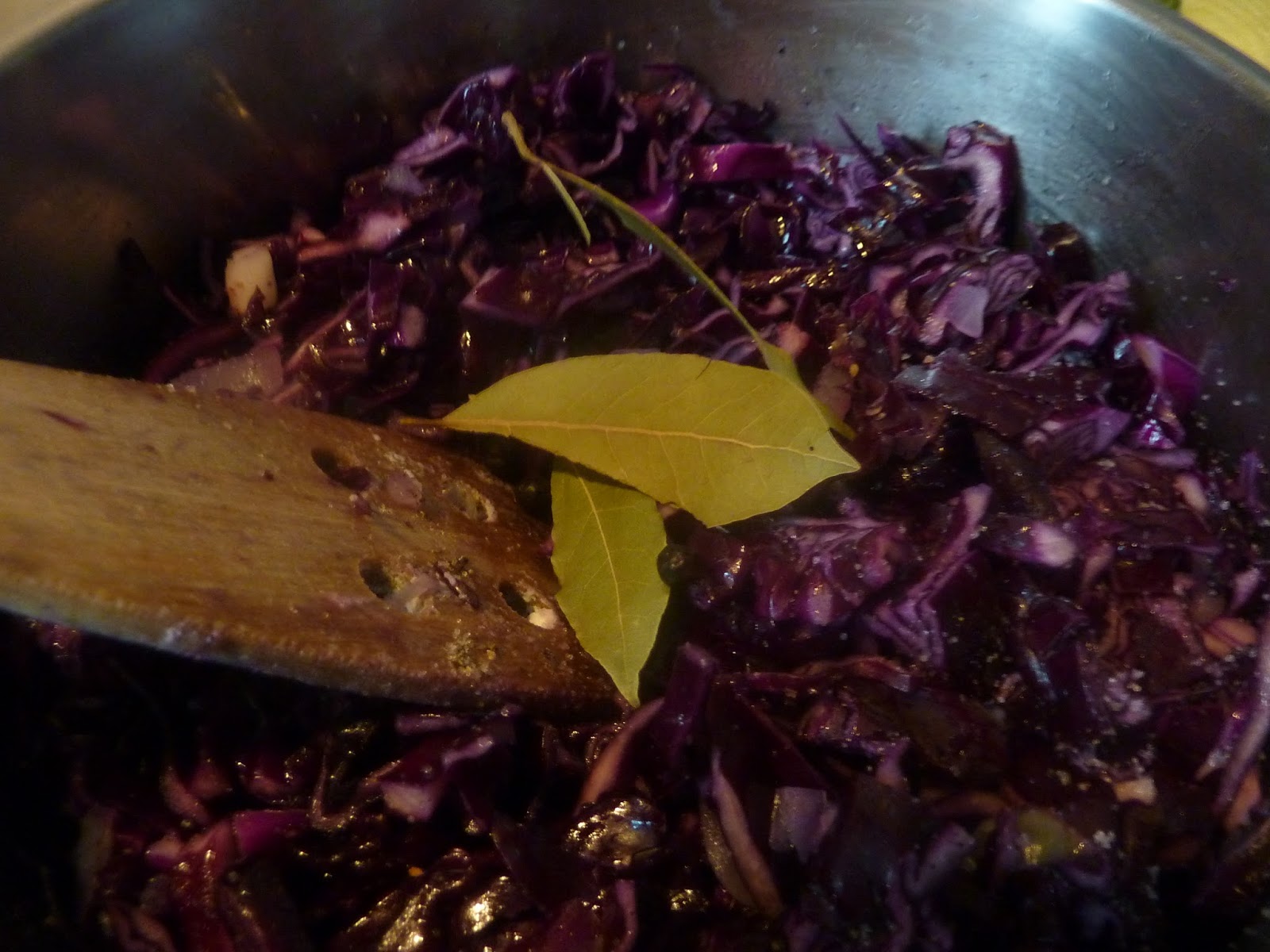 Die Flüssigkeit der mit Nelken eingekochten Birnen zum Rotkohl geben.