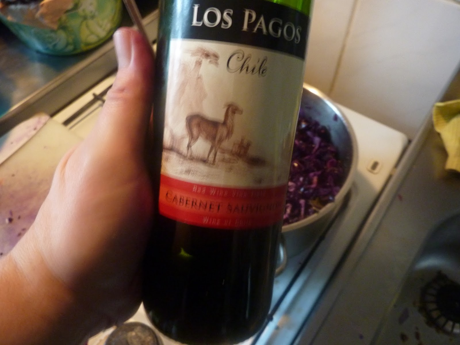 Einen Schuss Rotwein. Ich trinke freiwillig überhaupt keinen Rotwein, aber mag den Geschmack am Essen. Deswegen investiere ich da auch nicht in irgendwelche Schätze. Immerhin ist er aus Chile und hat 13 %.