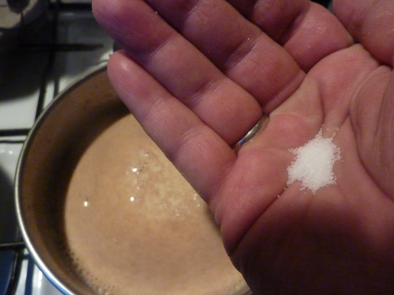 Wenn der Zucker leicht karamellisiert, mit dem halben Liter Milch auffüllen und eine Prise Salz hinzufügen. Der Zucker klumpt dann, aber das löst sich wieder auf, wenn Ihr die Milch erhitzt und ordentlich rührt.
