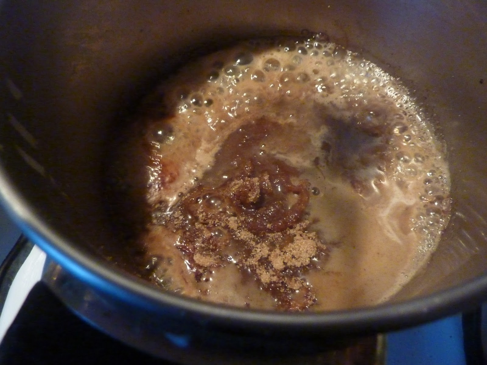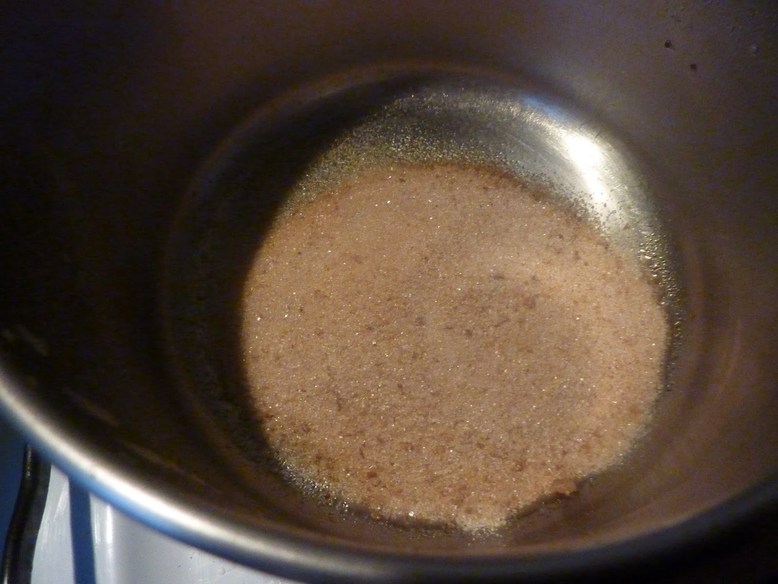 Je nachdem wie süß Ihr es mögt, 4 bis 5 Esslöffel der Zucker- und Zimtmischung in den Topf geben und den Topf kräftig aufheizen.