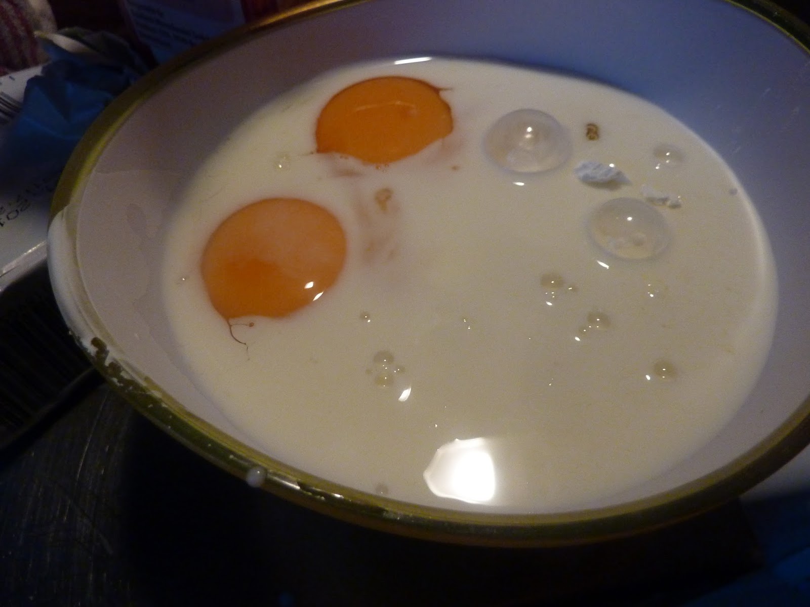 Wenn Ihr hier auch noch zwei Eier seht, solltet Ihr dringend Euren Alkoholkonsum überprüfen, da ist wirklich nur EIN Ei zu sehen. Ich schwöre! 6 Esslöffel Milch in die Schüssel löffeln.