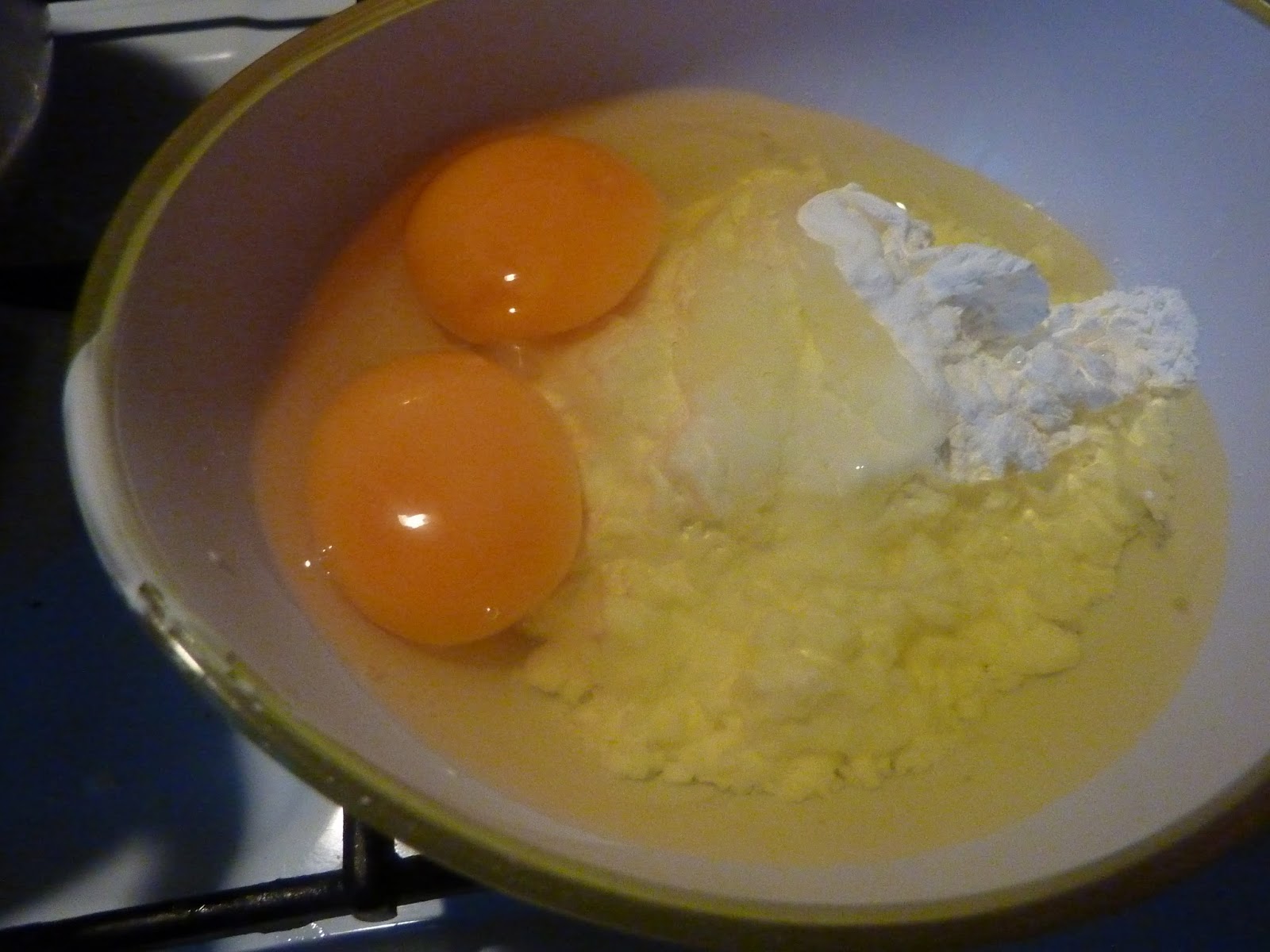 Ich weiß, Ihr seht da ZWEI Eier, aber ich habe auch die doppelte Menge Pudding gekocht. Glaubt also einem alten Mann, wenn da steht, dass Ihr nur EIN Ei braucht. Das EINE Ei aufschlagen und zur Speisestärke geben.