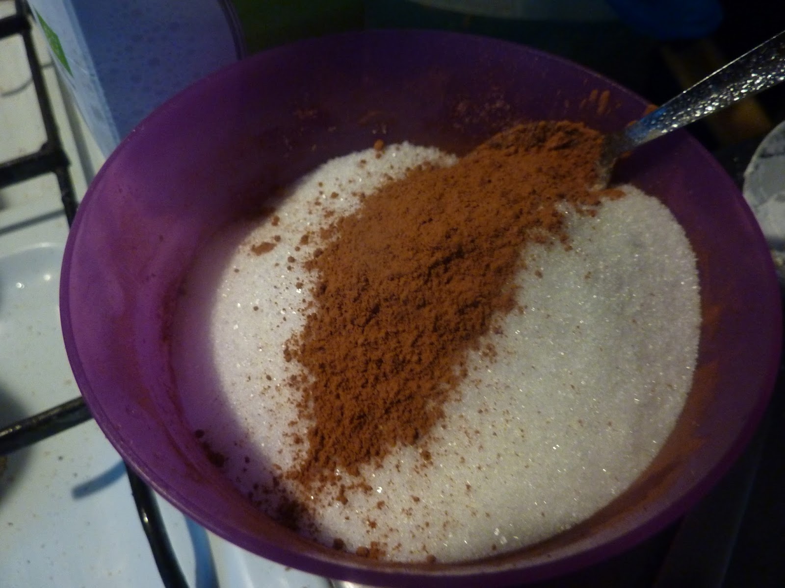 Ich habe mir eine Zucker und Zimtmischung angerührt. Das sind natürlich keine 4 oder 5 Esslöffel Zucker. Ich brauche das öfter in der Küche, weil meine Kinder viel Milchreis essen und das geht dann immer so nebenbei weg. Wer das nicht häufiger braucht, der mischt sich halt nur die Menge, die er für den Pudding konkret braucht.