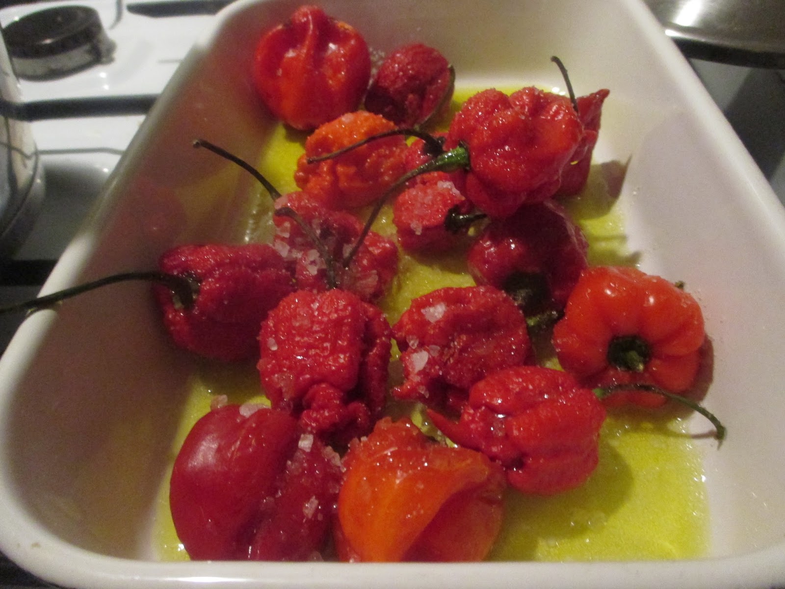 Red Habanero und Carolina Reaper zusammen in eine Ofenform legen. Ich lasse die Stiele noch dran. Die gehen nach dem Garen deutlich leichter raus.