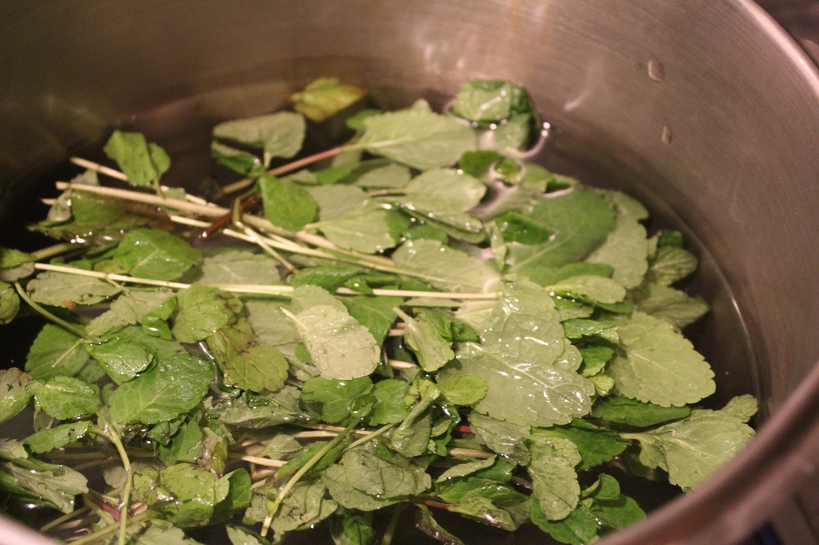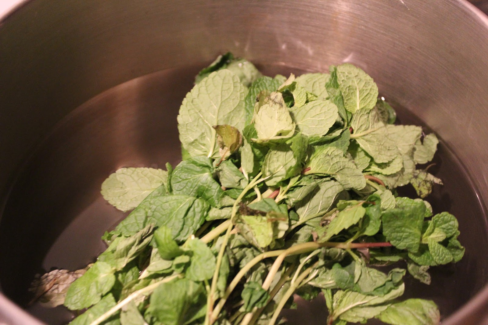 Ich nehme einen großen Kochtopf voll Wasser und koche das Wasser ganz kurz auf, dann sofort den Herd abstellen und die Minzblätter im Wasser ziehen lassen. Mit der Menge Minzblätter kann man auch einen 5 Liter Topf Wasser bespielen, wenn man sie lange genug ziehen lässt. Ich lasse die Minzblätter einfach im Wasser liegen, damit der Geschmack immer intensiver wird. Je länger je lieber. Bei uns wird im Normalfall aber auch nichts alt, bei sechs Menschen im Haushalt, die den ganzen Tag nichts anderes machen, als irgendwas zu wollen, ich habe durst, ich will was essen, you know.