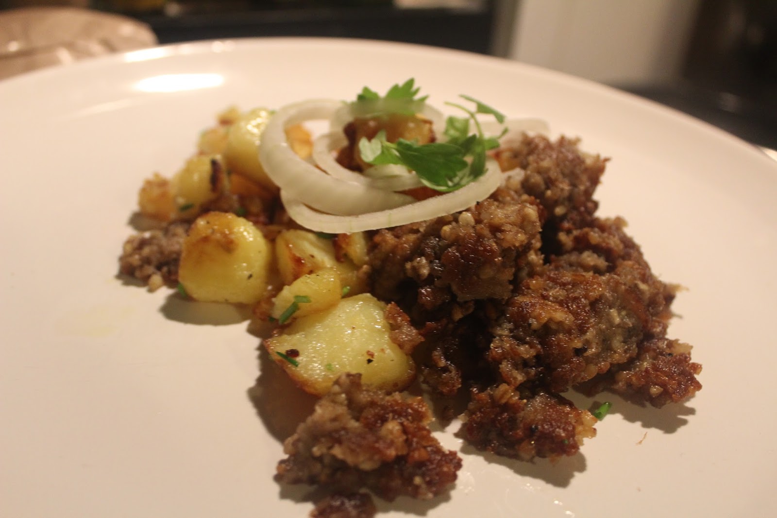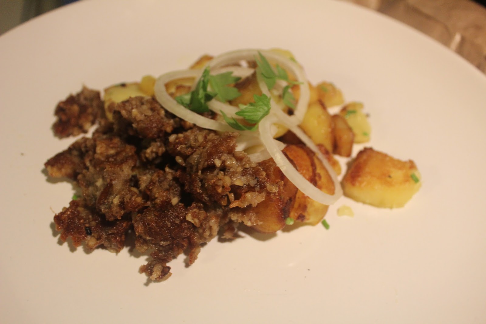 Vorne die Bratkartoffeln, im Hintergrund das Knipp. Das Knipp zerfällt beim Braten in der Pfanne. Die Pfanne läuft auf der größten Herdplatte auf Vollgas.