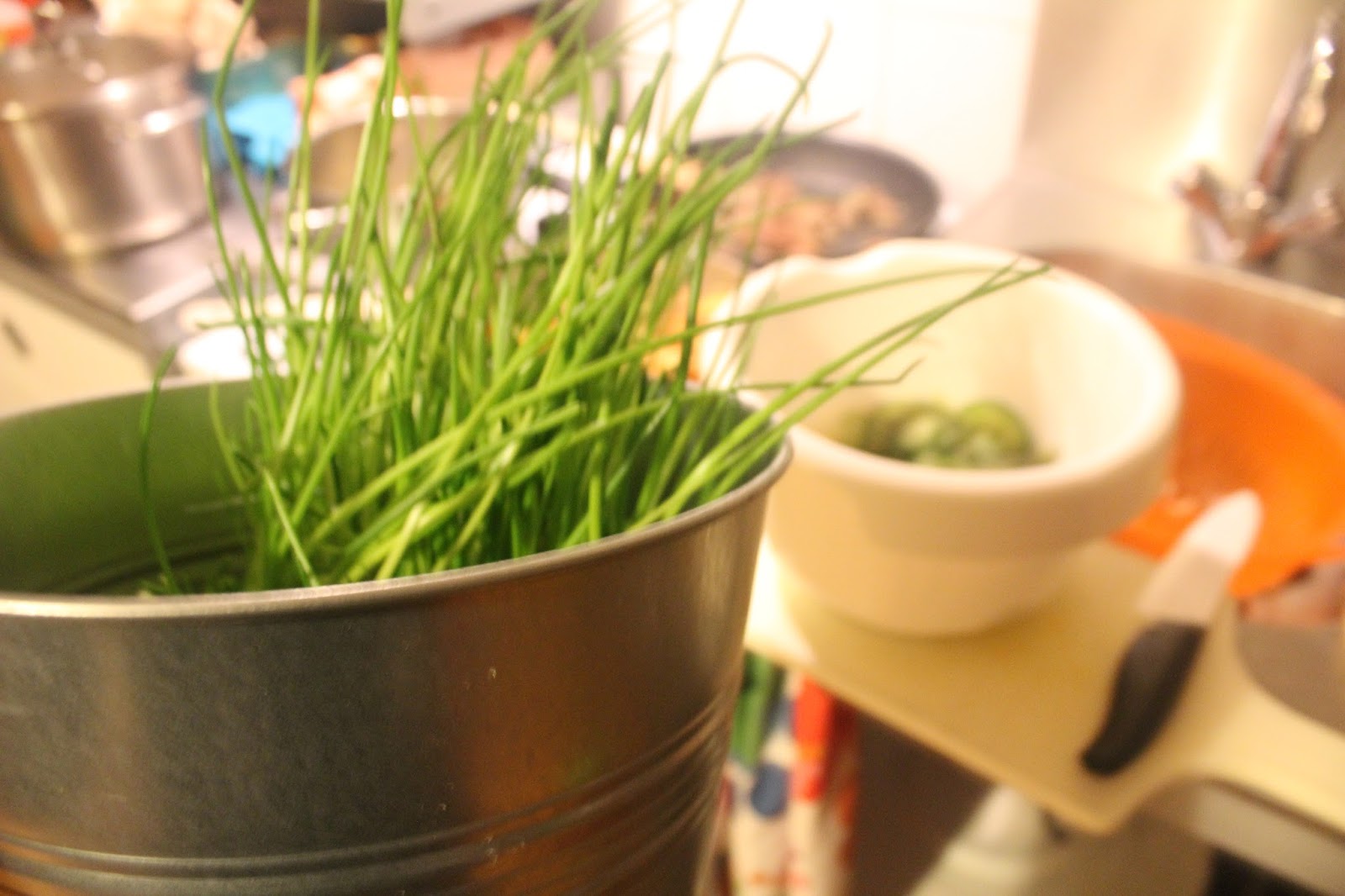 Den frischen Schnittlauch mit der Schere zerkleinern.