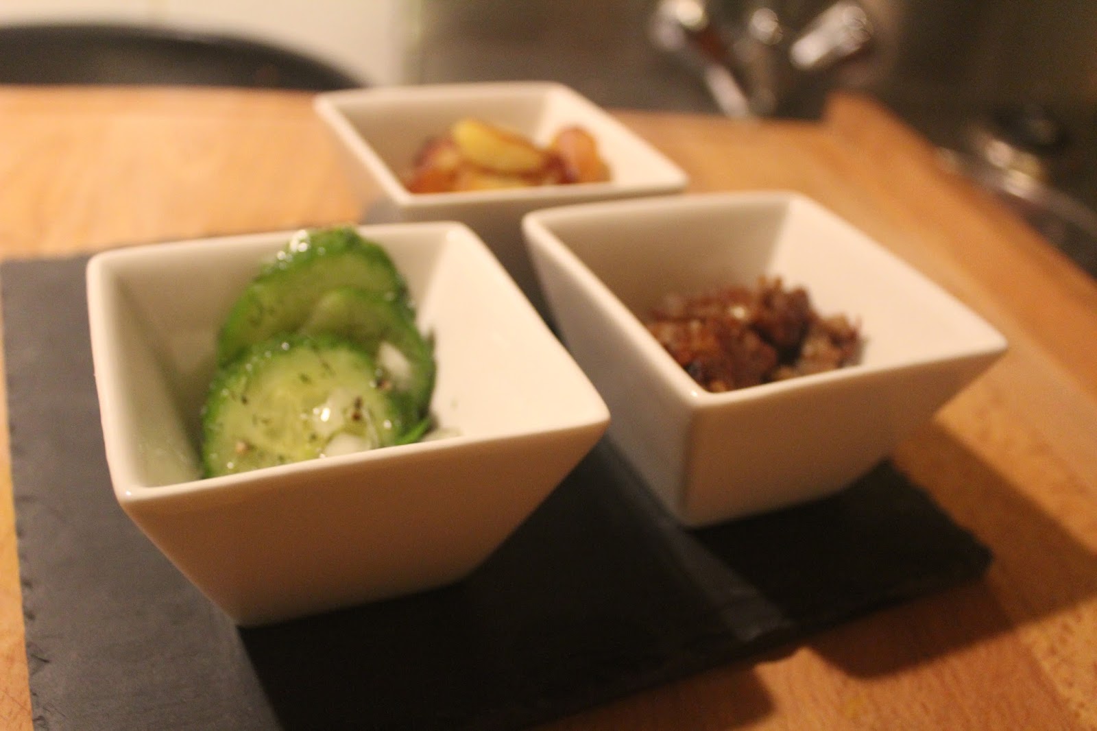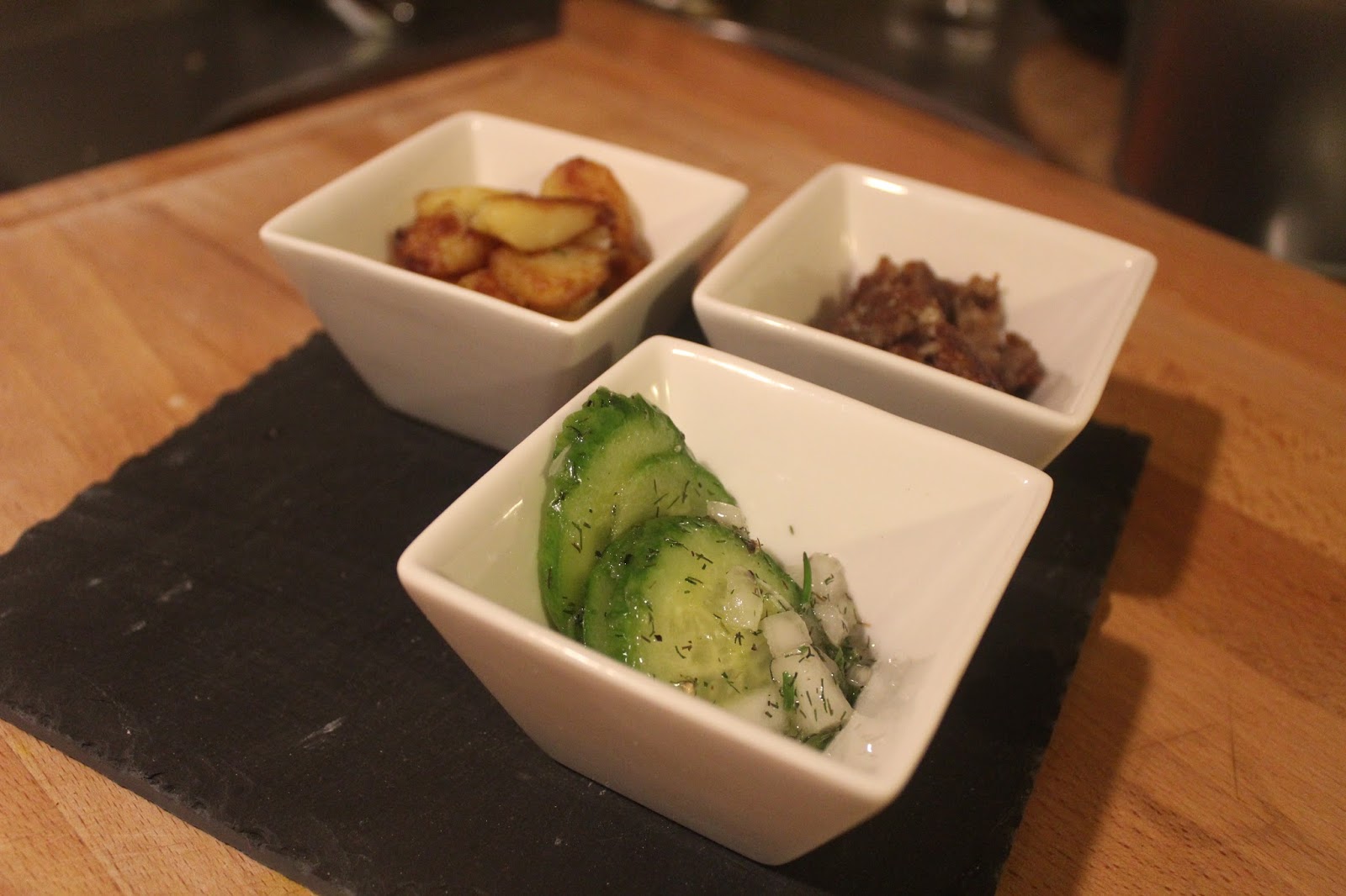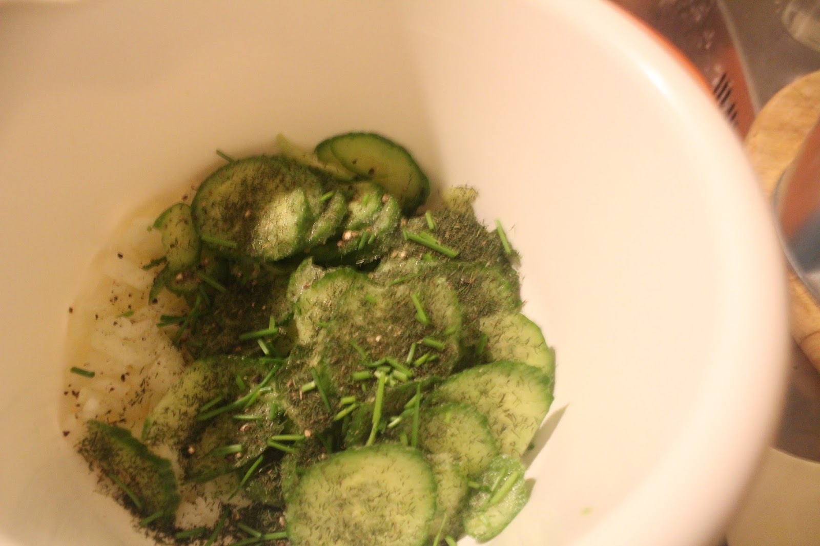 Zusätzlich Dill, Salz, Pfeffer und Zucker zum Würzen an den Gurkensalat geben und mit Pflanzenöl und Branntweinessig marinieren. Das ist ganz einfacher Gurkensalat, aber eben frisch und lecker und dem Rest des Gerichts angemessen. Der muss quasi so sein und braucht nicht mehr Chichi.