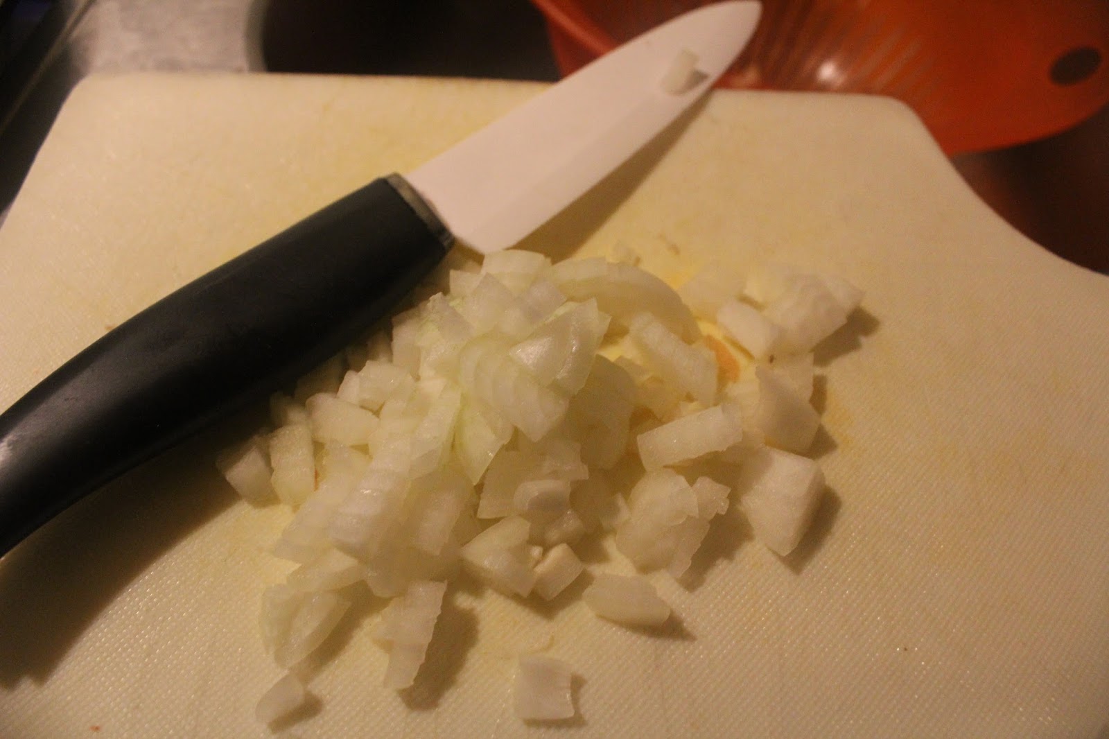 Die erste Zwiebel zerkleinern für den Gurkensalat