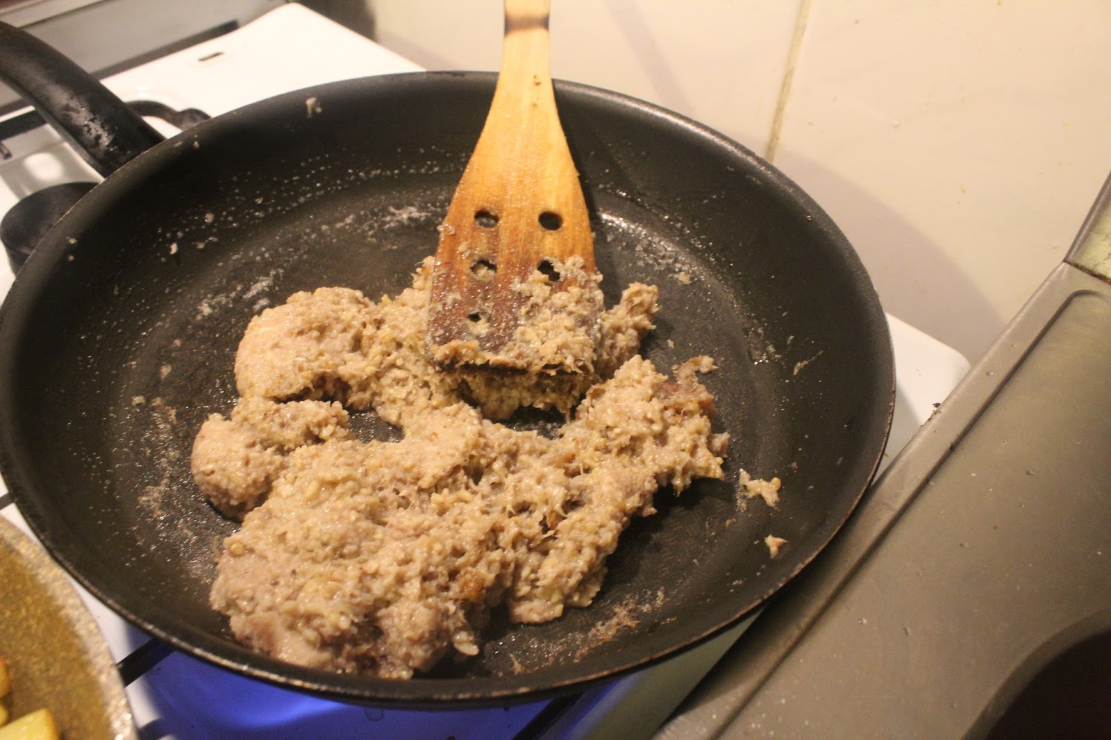 Hier zerfällt das Knipp dann beim Braten. Sieht im ersten Moment aus, wie in die Pfanne gekotzt und da hilft es wirklich nur das ordentlich zu bräunen, oder er stellt sich der Effekt ein, der mich bis heute verfolgt hat, dass man es nicht essen möchte.