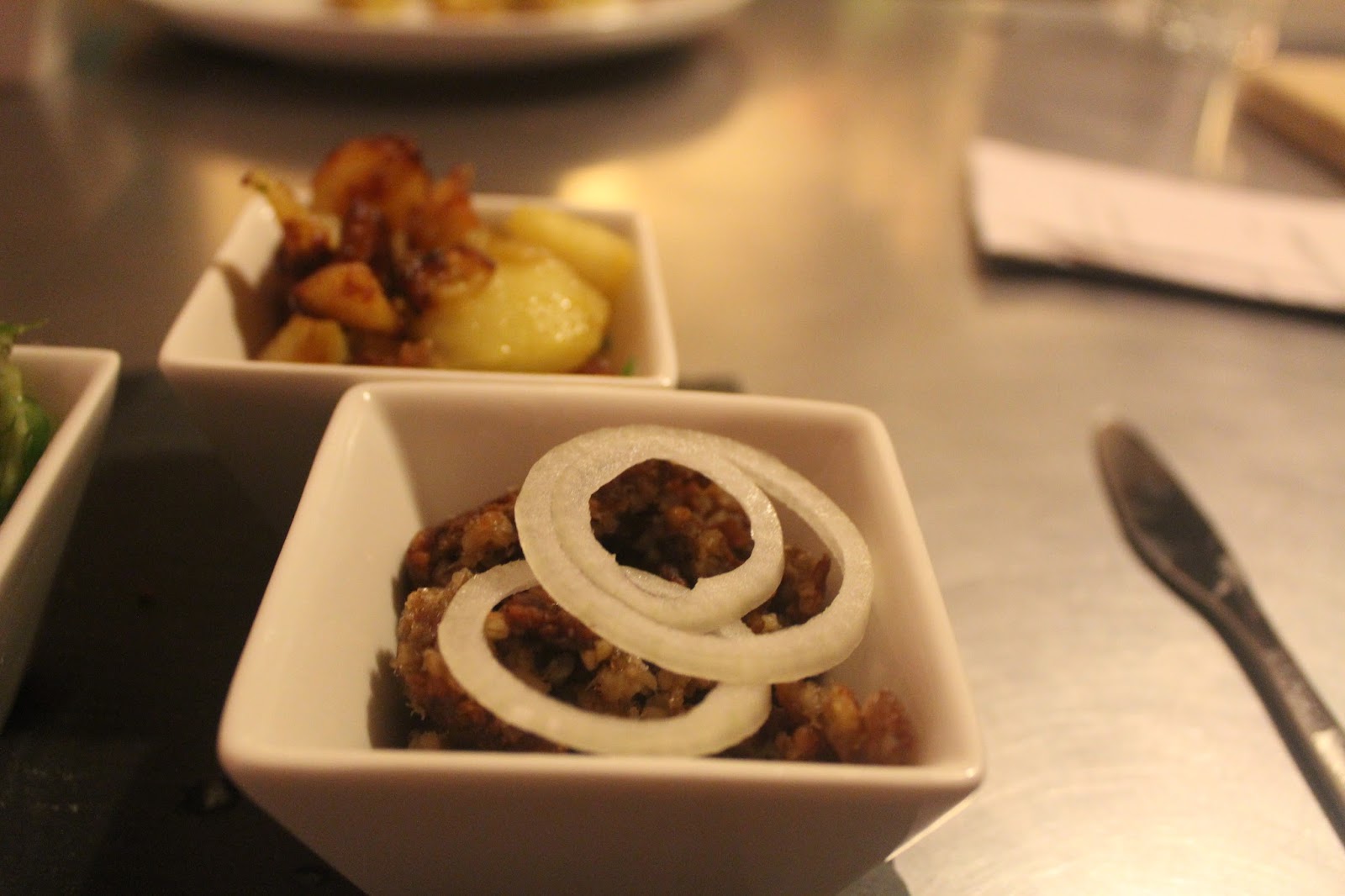 Nachdem ich gestern mit Sarah Dhem, der Chefin von Kalieber telefoniert habe, ließ sie in einem Nebensatz fallen, dass in dem Paket Grützwurst wäre und dass das sowas wie Knipp wäre. Das fetteste vom Schwein, mit Hafergrütze, Schwarte und allem was weg muss, in einem Plastikdarm gebrüht. Ich habe dann gedacht, dass es nicht schlecht schmecken kann, wenn es von Kalieber ist und die Erfahrung habe ich ja schon seit längerem gemacht, dass man aus allem etwas machen kann, wenn es handwerklich ordentlich zubereitet wird und man sich da keine Schwächen leistet.