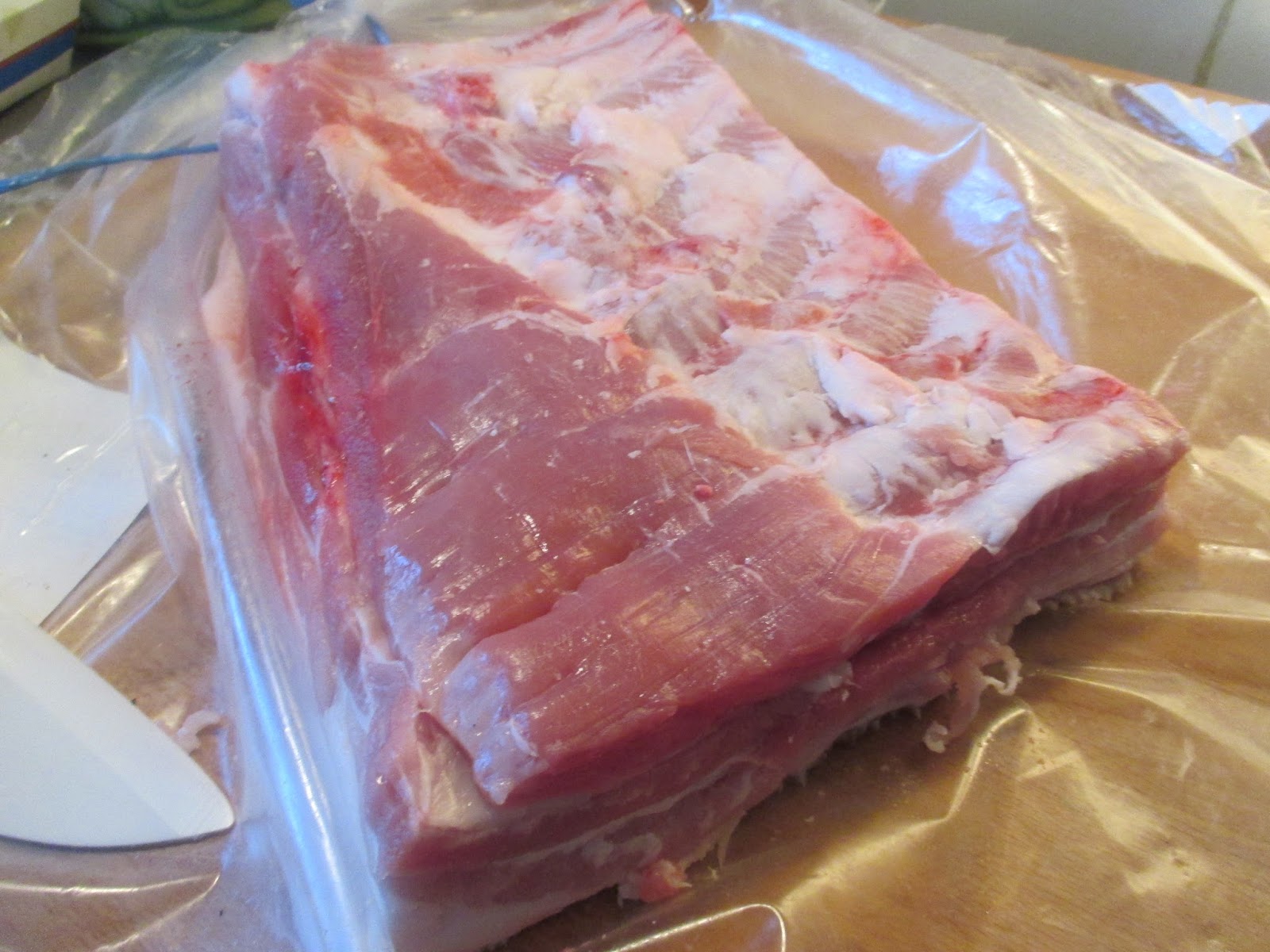 Hier habe ich das Stück Schweinebauch schon geteilt. Der ist übrigens mit Knochen. Ich finde den auch ohne Knochen o.k, aber alles was man mit Knochen gar, wird insgesamt saftiger und zarter, als wenn man das gleiche Stück Fleisch entbeint zubereiten würde.