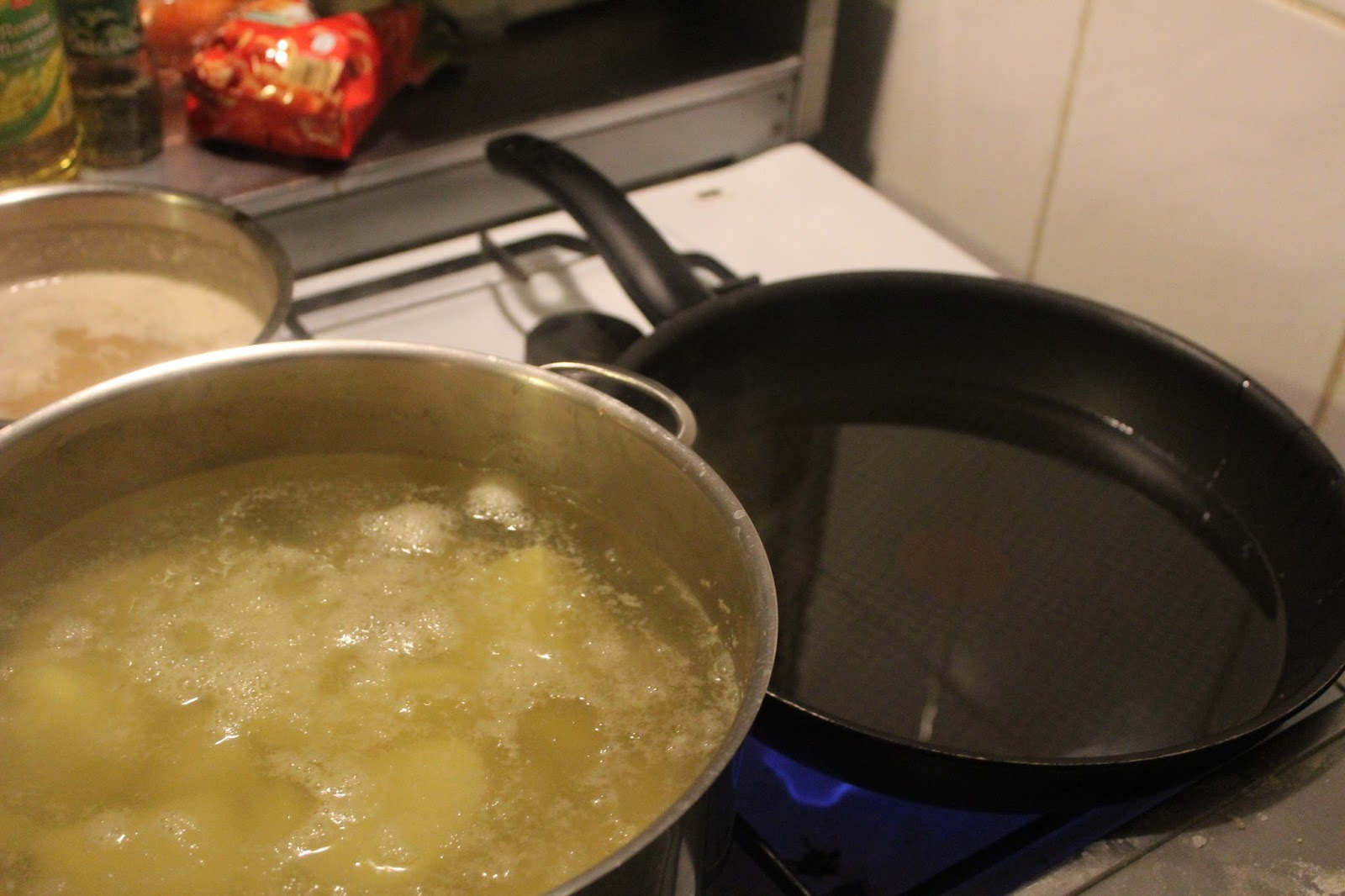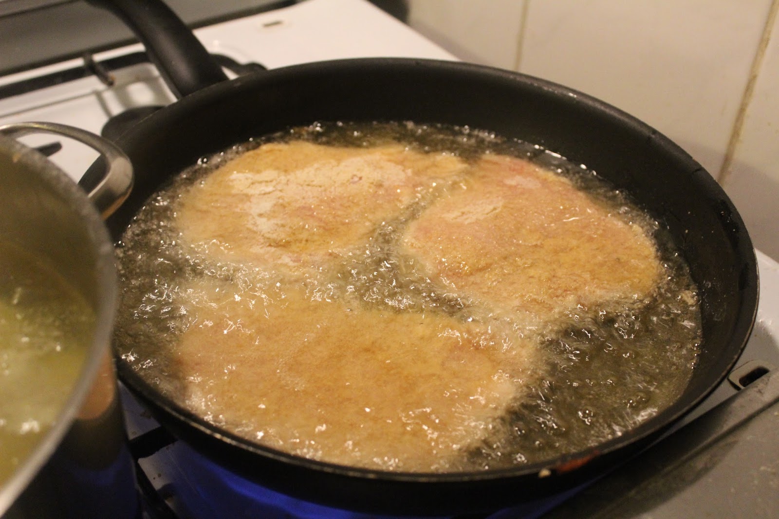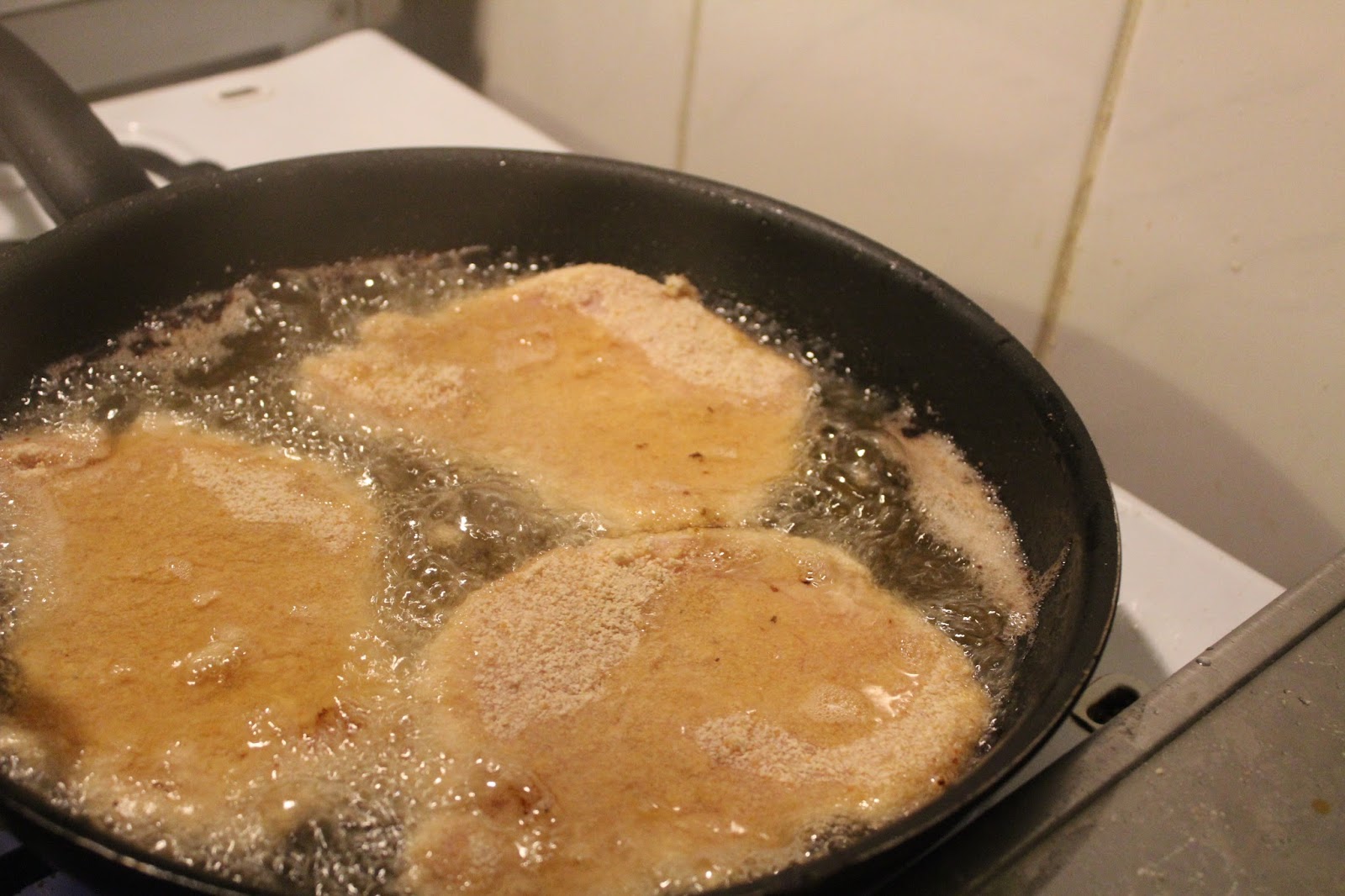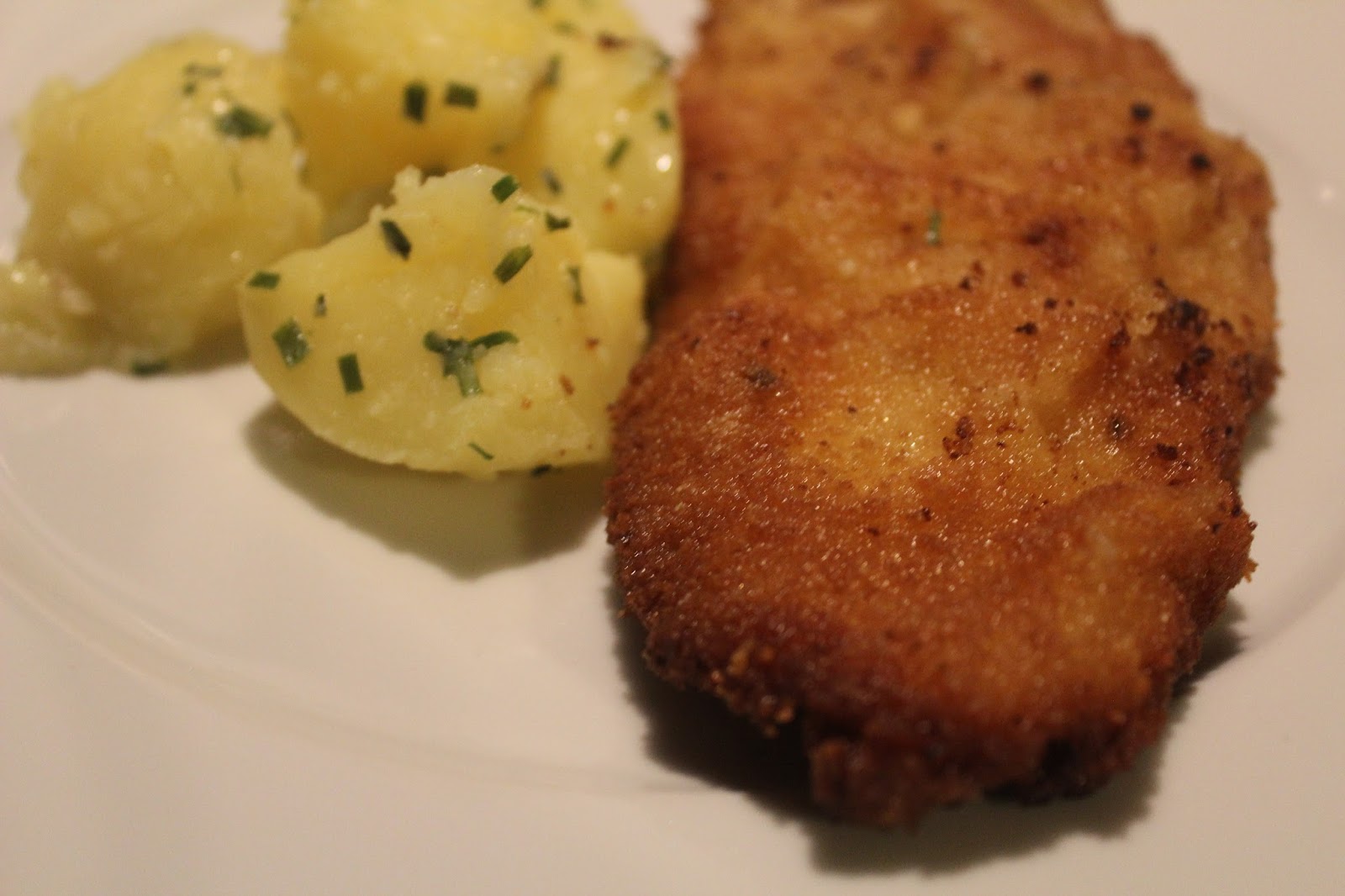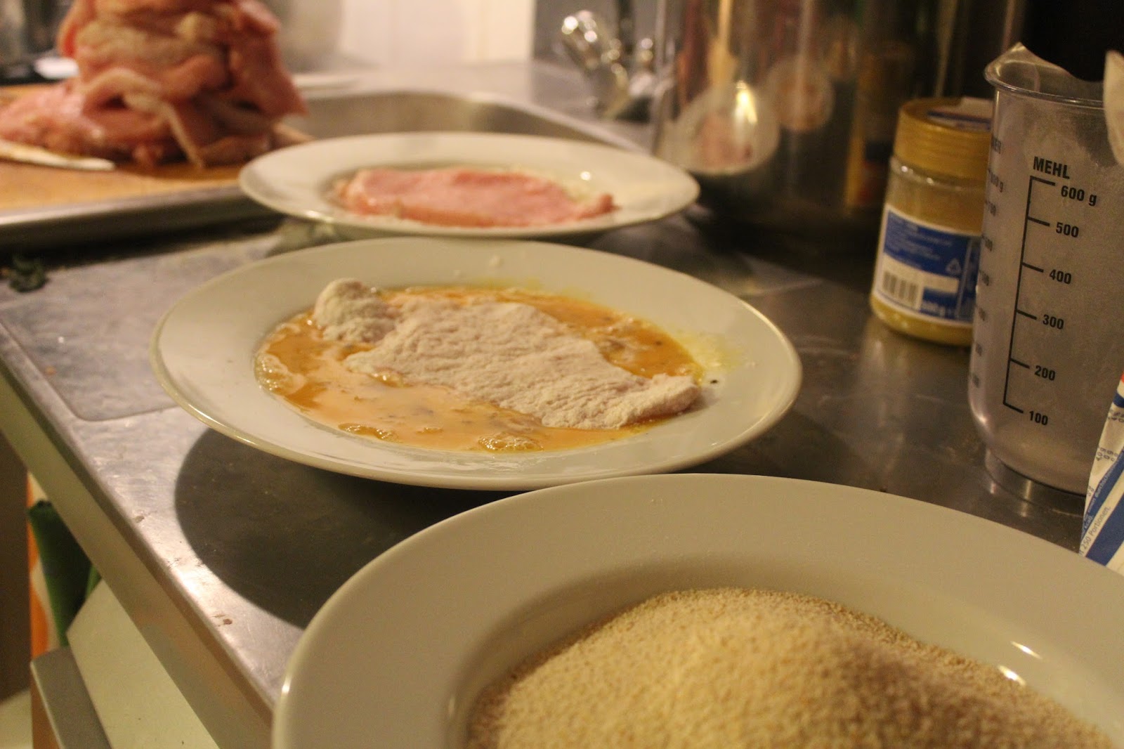 Die Kartoffeln und die Soße brodeln vor sich hin. Nun kommen die panierten Schnitzel dran.