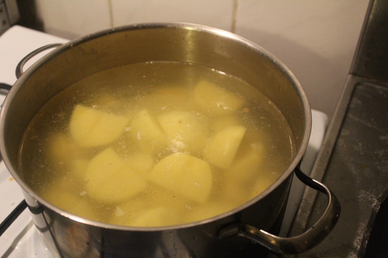 1 Kilo Kartoffeln schälen und mit Salzwasser 20 Minuten kochen.