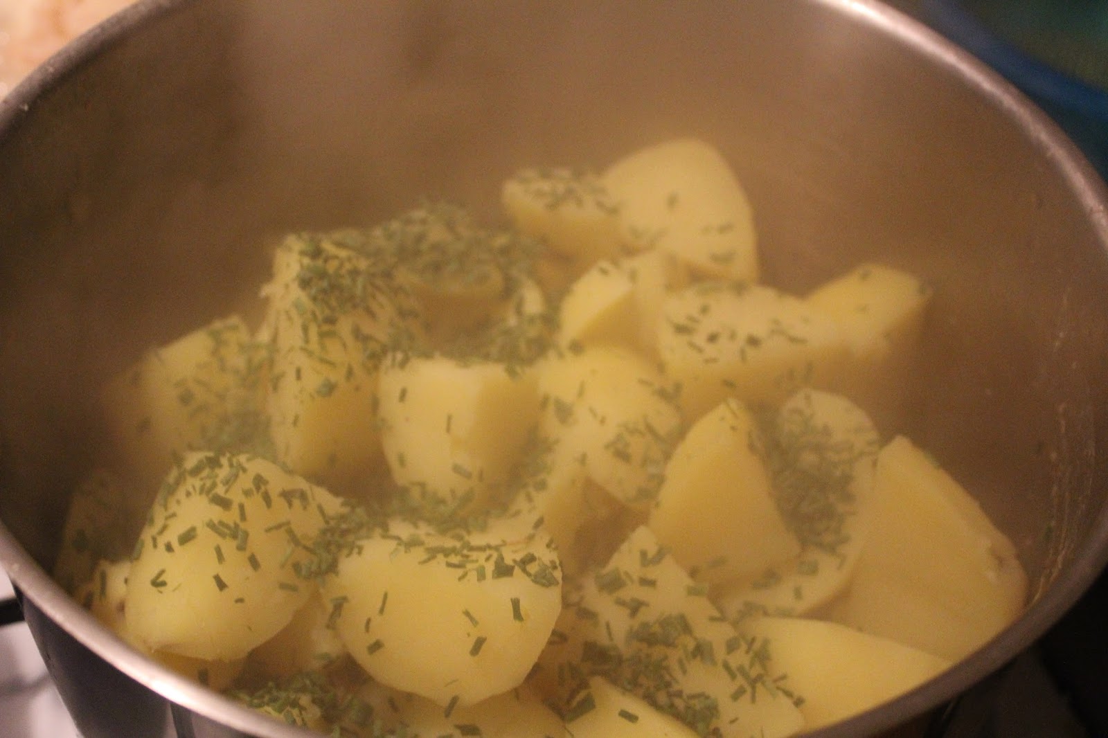 Wenn die Kartoffeln gut sind, Wasser abkippen, Schnittlauch dazu geben und ein Stück Butter in den Topf werfen. Deckel wieder auf den Topf legen. Dann hat man bei den Kartoffeln erstmal Ruhe und muss sich nicht weiter quälen. Die halten dann die Hitze.