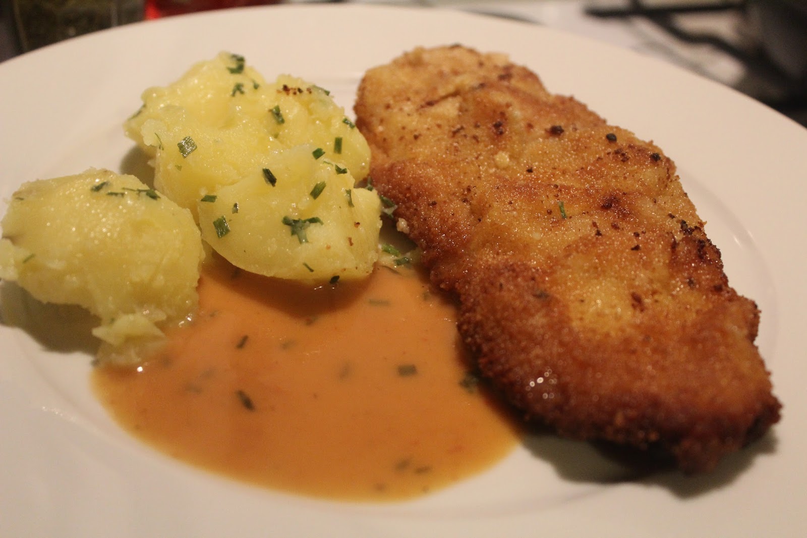 Jetzt flippen wieder alle in Österreich aus, weil dort Schnitzel und Soße so nah zusammen gehören, die der Teufel und Weihwasser, aber bei den Piefkes muss es so sein, sorry. Einen Klecks Soße auf den Teller geben, aber bitte nicht so, dass man das Fleisch damit ertränkt und vor allem nicht die mühevoll kross gebratene Panierung aufweicht. Nehmt liebt später noch bei der Soße nach, als durch zuviel Soße die Arbeit zu schänden.
