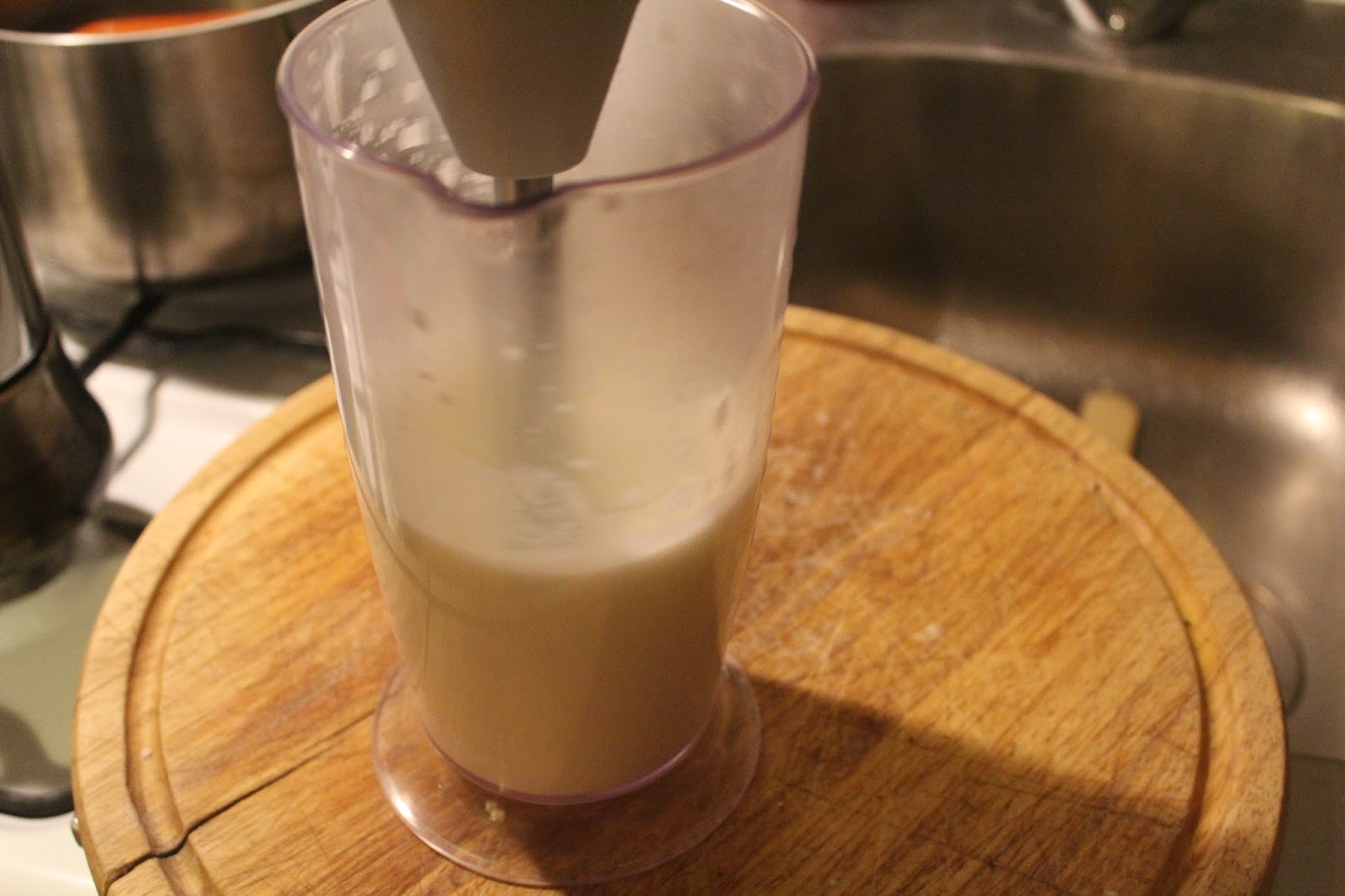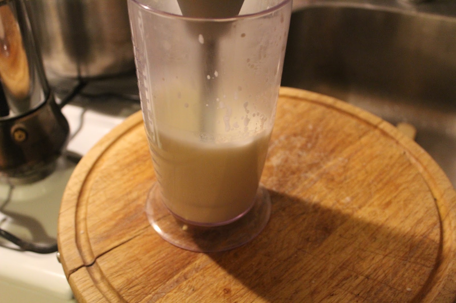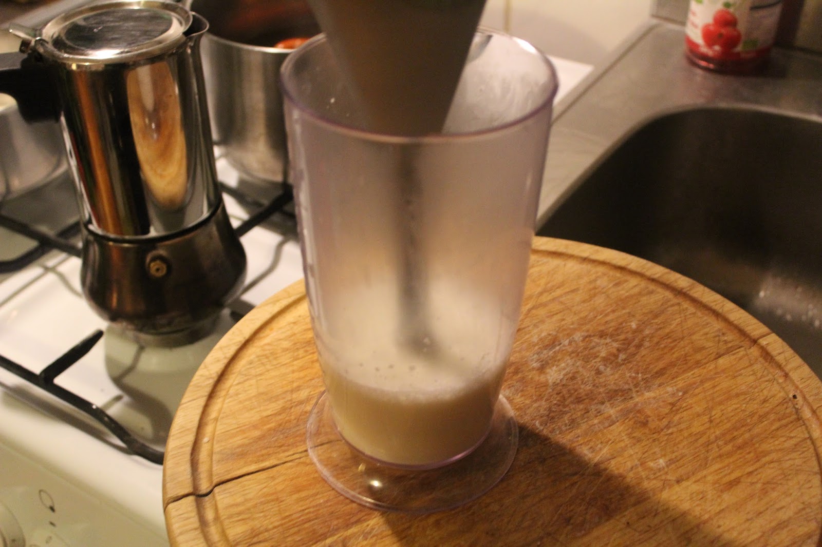 Die warme Milch in einen Mixbecher kippen und dann den Zauberstab einfach nur in den Becher stellen und mit 19000 Umdrehungen drehen lassen.