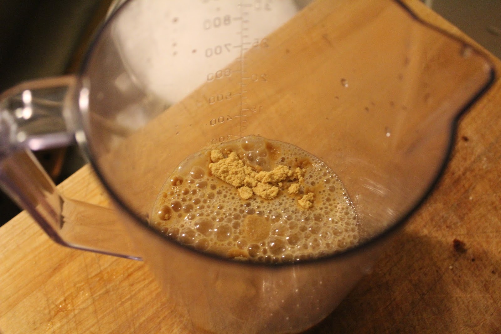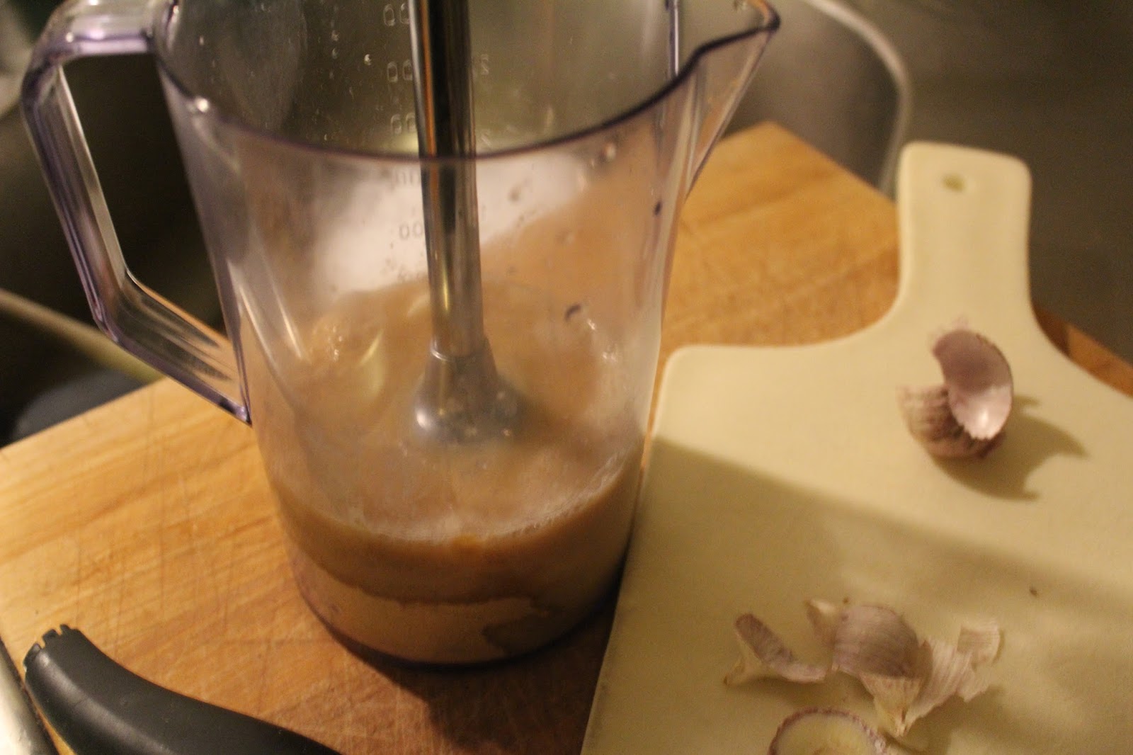 Senfmehl, Essig und Knoblauch miteinander verrühren. Dafür kann man einen Pürierstab benutzen, einen Zauberstab, oder einen Mixbecher.