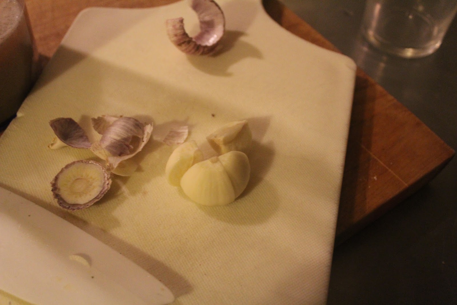 Knoblauch schälen und nach Geschmack zum Senf geben. Ich nehme diese großen Knoblauchknollen, wie auf dem Bild zu sehen. Die sind nicht so geschmacksintensiv wie Knoblauchzehen.