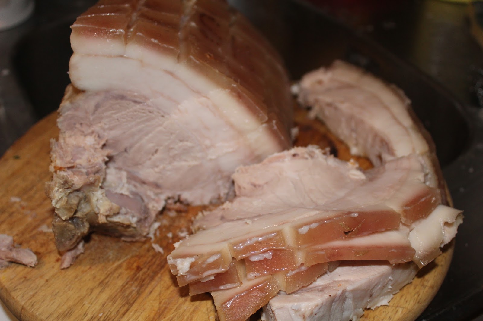 Habt Ihr die Speckschwarte gesehen? Ekelig? Nö, die gibt Geschmack, die macht das Fleisch zart, die kann man hinterher noch recyclen und einen Brühe daraus kochen.