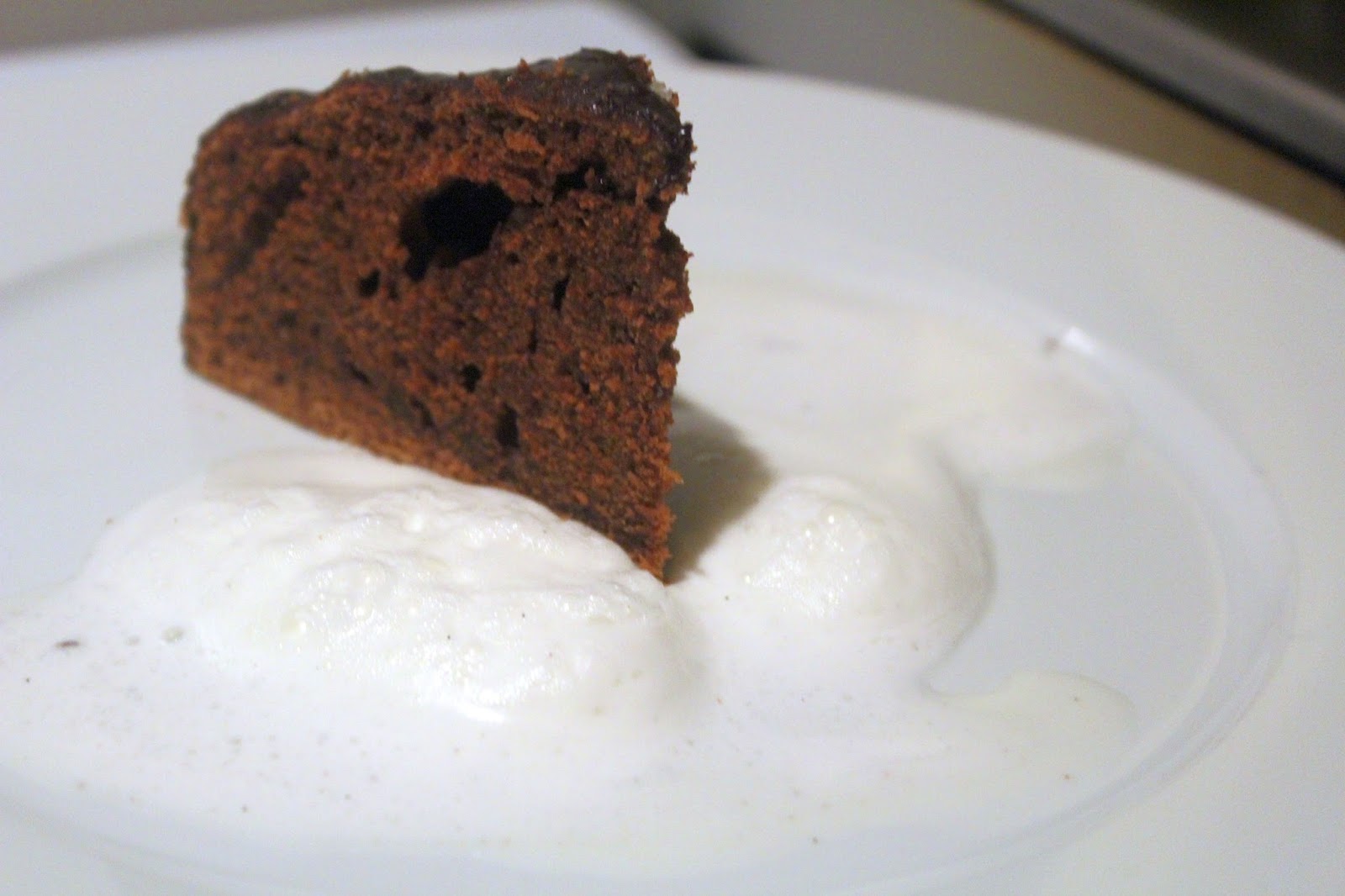 Vor dem Servieren Milch bis ca 70 Grad erwärmen, mit Puderzucker süßen und aufschäumen. Ich habe einen Zauberstab von Esge, aber man kann auch einen klassischen Milchaufschäumer, oder einen Schneebesen, oder einen Pürierstab zum Schäumen nehmen. Optimal ist magere Milch mit 1,5 % Fett, weil sie sich am besten schäumen lässt. Wer den Schaum ein wenig fester haben möchte, kann auch Gelatine, oder Agartine dazu geben. Wenn man den Kuchen sofort auf den Teller bringt und den Schaum gerade frisch gemacht hat, kann es auch sofort losgehen.