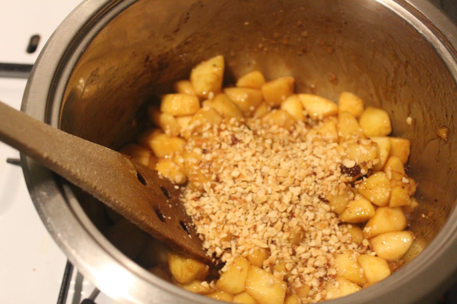 Die Nüsse mit dem den Äpfeln zusammen kochen. Wenn die Mischung zu trocken wird mit Wasser angießen, oder auch mit Alkohol, wenn Ihr das mögt.