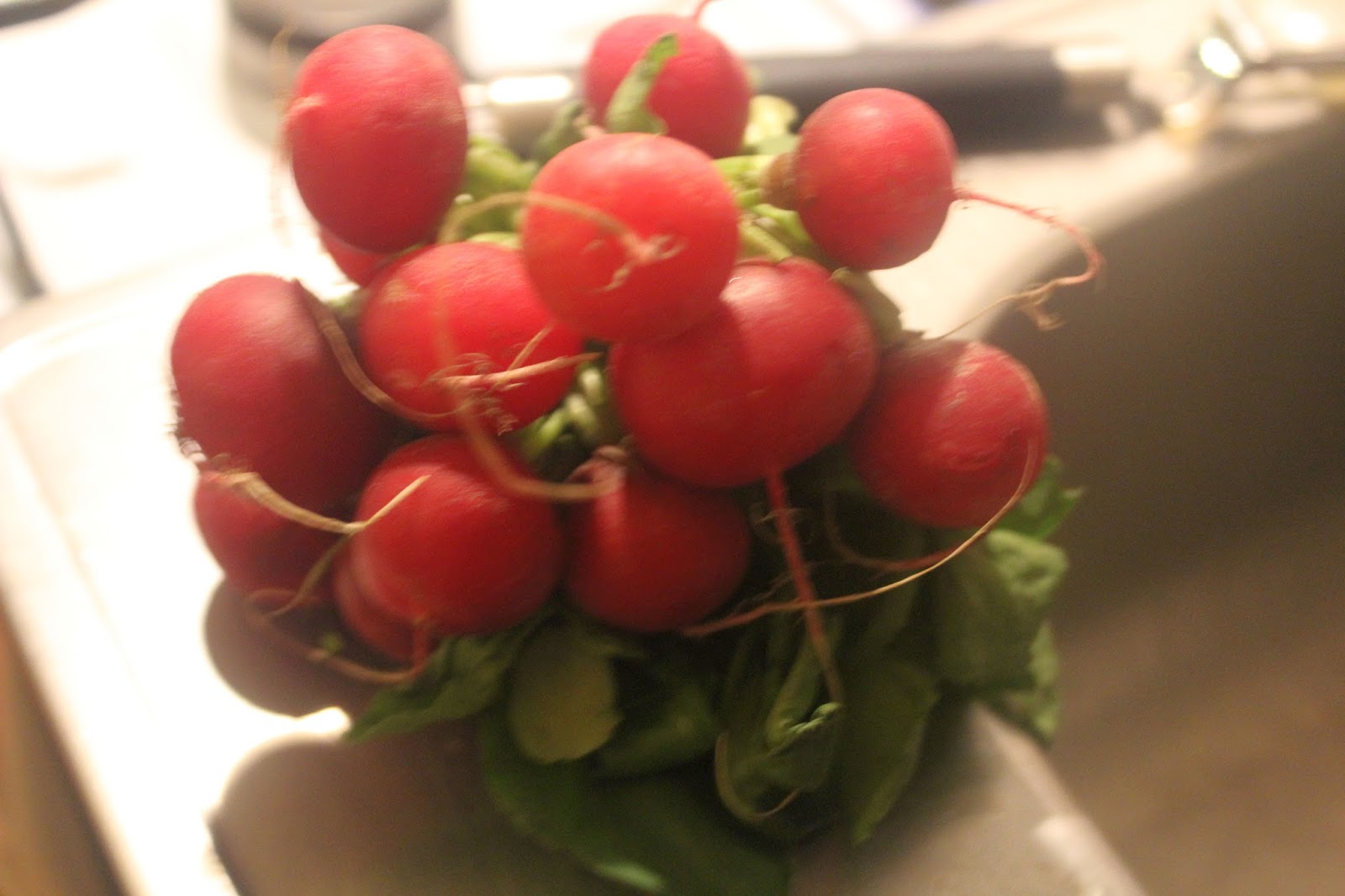 Ein Bund Radieschen. Für das Grün lasse ich mir auch noch etwas einfallen, aber das war mir nach drei Tagen im Kühlschrank schon ein bisschen zu welk, um damit jetzt etwas anzustellen. Für Pesto geht das sonst immer.