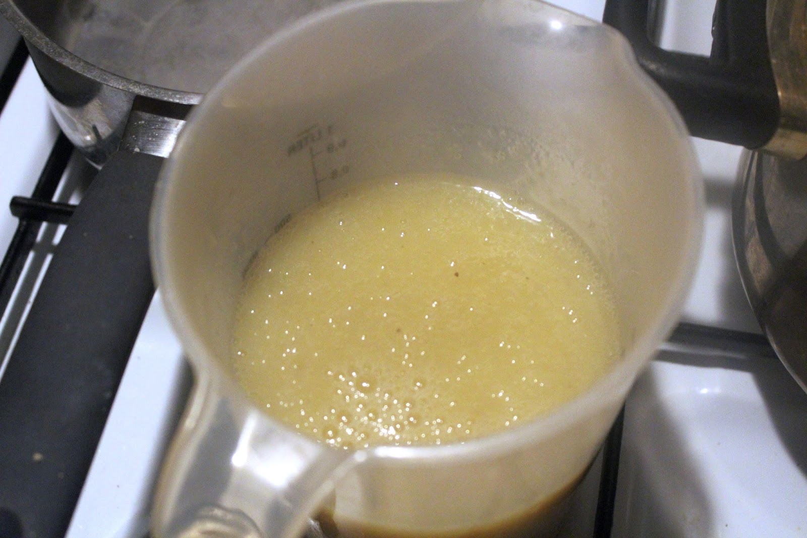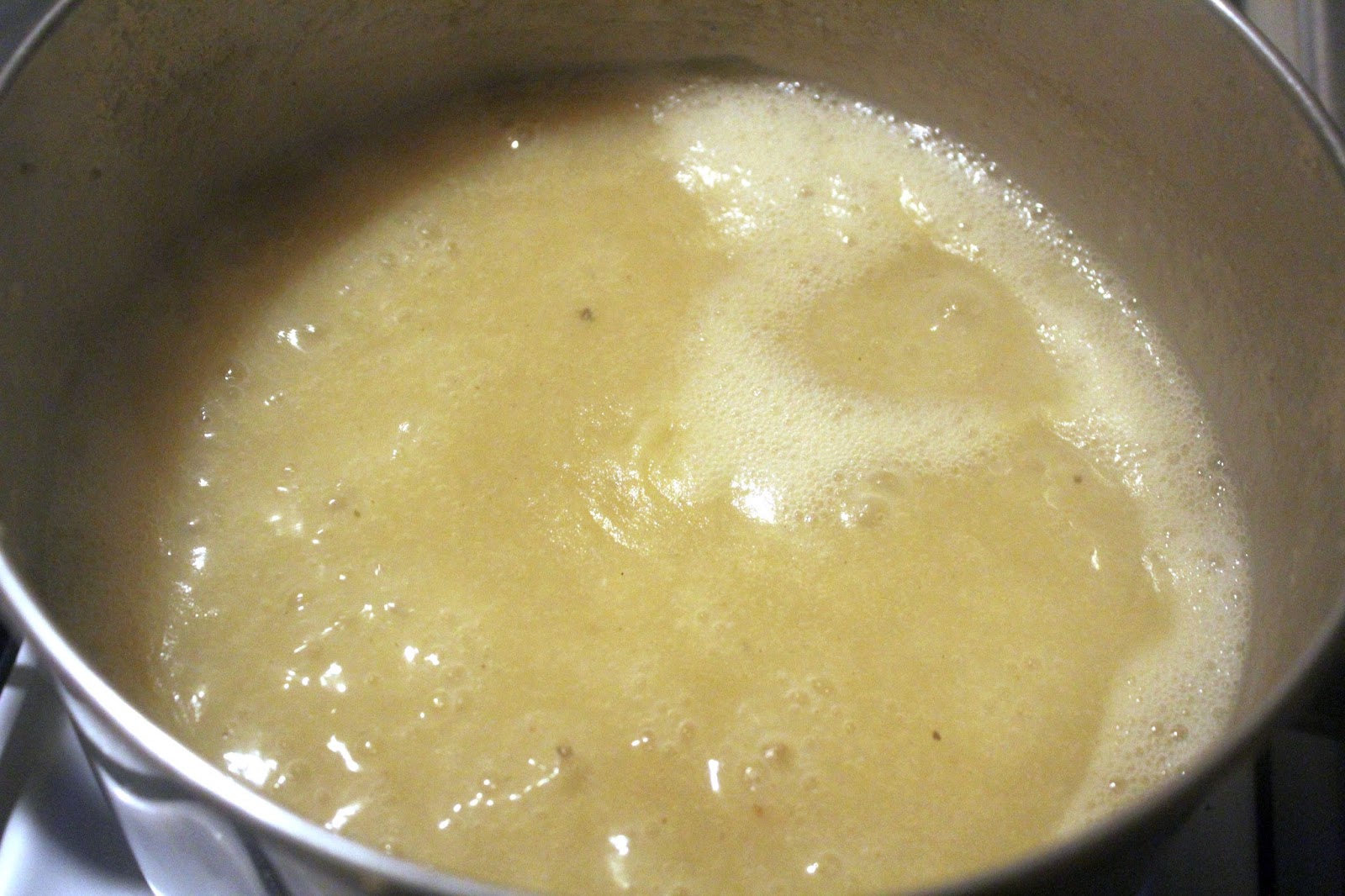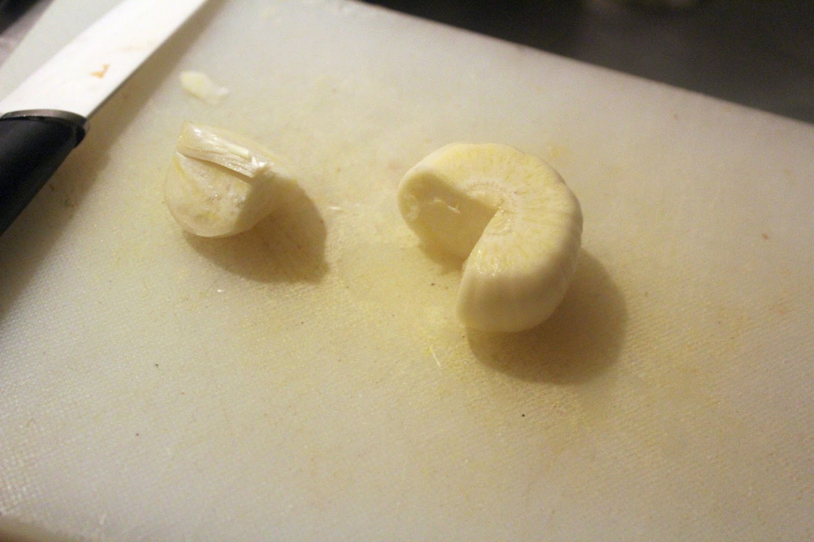 Freilandknoblauch. Eine ganze war mir für die Menge zuviel, deswegen habe ich davon nur ein Viertel genommen. Wer mit seinem Atem auch gerne mal Fliegen von der Decke holt, kann auch eine ganze Knolle nehmen.