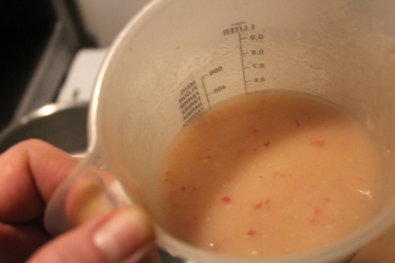 Teile der pürierten Suppe in ein Litermaß kippen. Mir ist der Topf zu breit, um alle Radieschen ordentlich pürieren zu können, deswegen nehme ich den schmaleren Behälter.