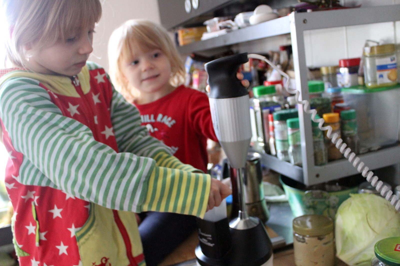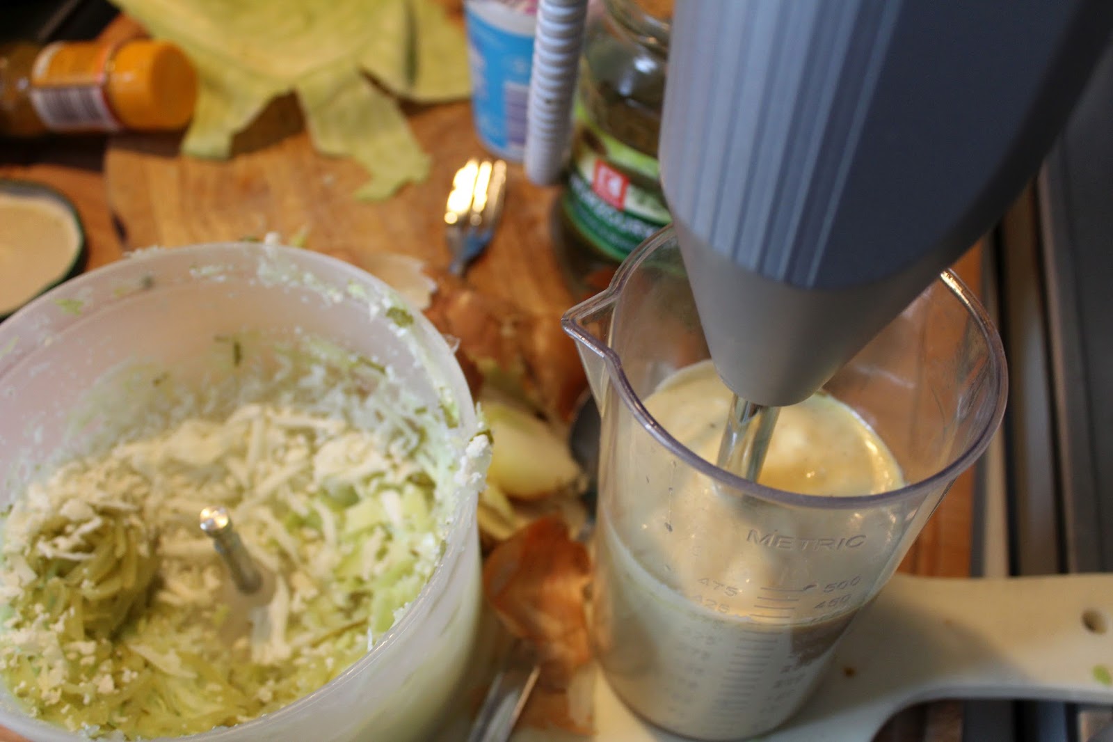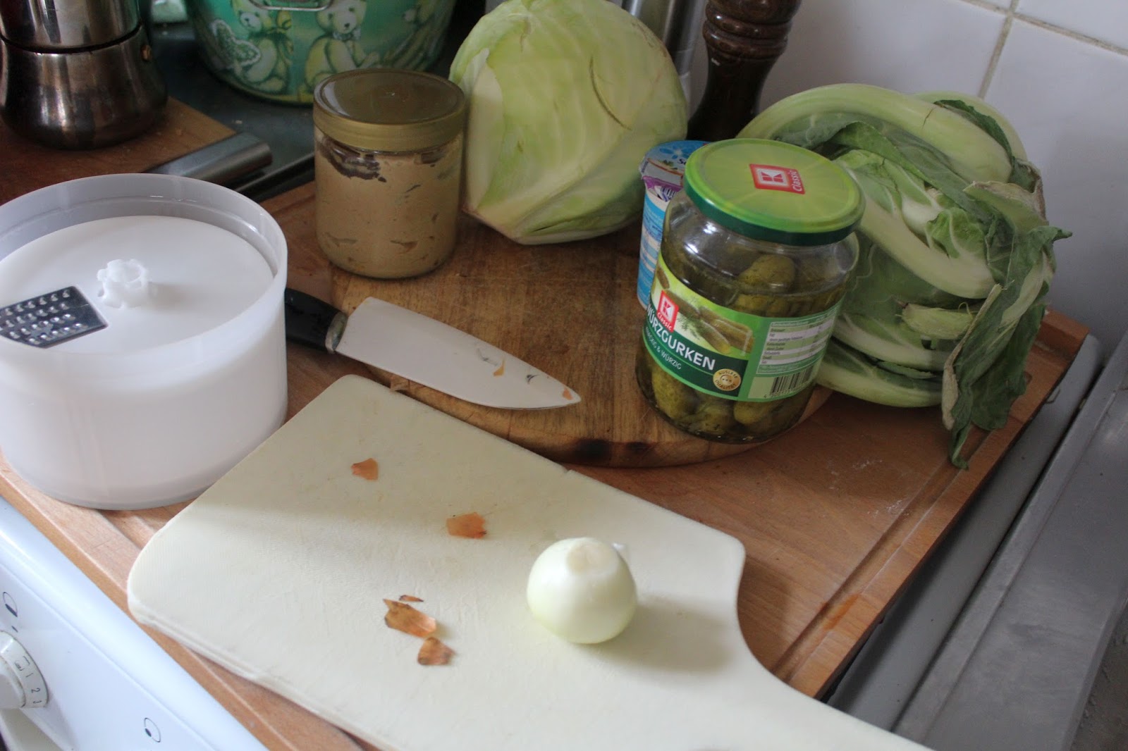 Hier ist meine Zauberette, die hilft mir beim Zerkleinern meiner Zutaten. Wer keine hat, fällt auch nicht tot um und kann eine Standreibe, oder ein Messer nehmen und braucht dann halt 30 Sekunden mehr.
