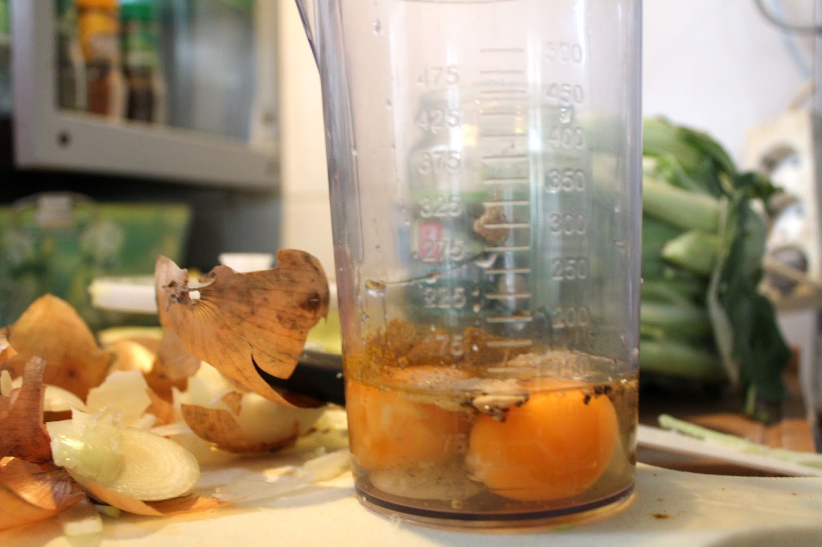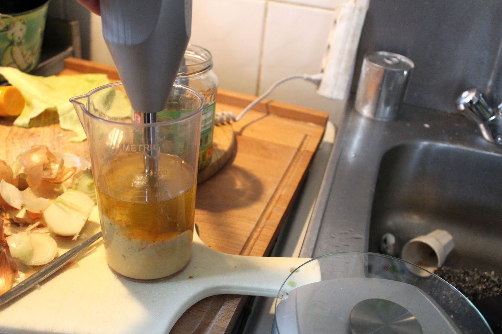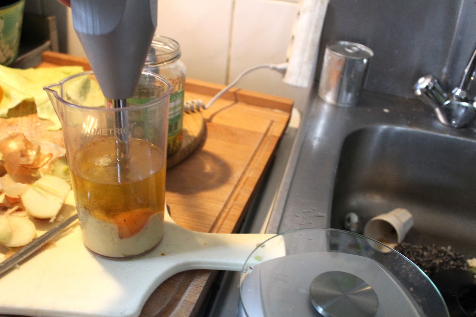 Weil der Zauberstab aber 19000 Umdrehungen pro Minute dreht, schlägt der alles schaumig, was bei drei nicht auf dem Baum ist. Deswegen kippe ich noch 200 Milliliter Pflanzenöl in den Mixbecher und spare mir die oben beschriebene Prozedur.