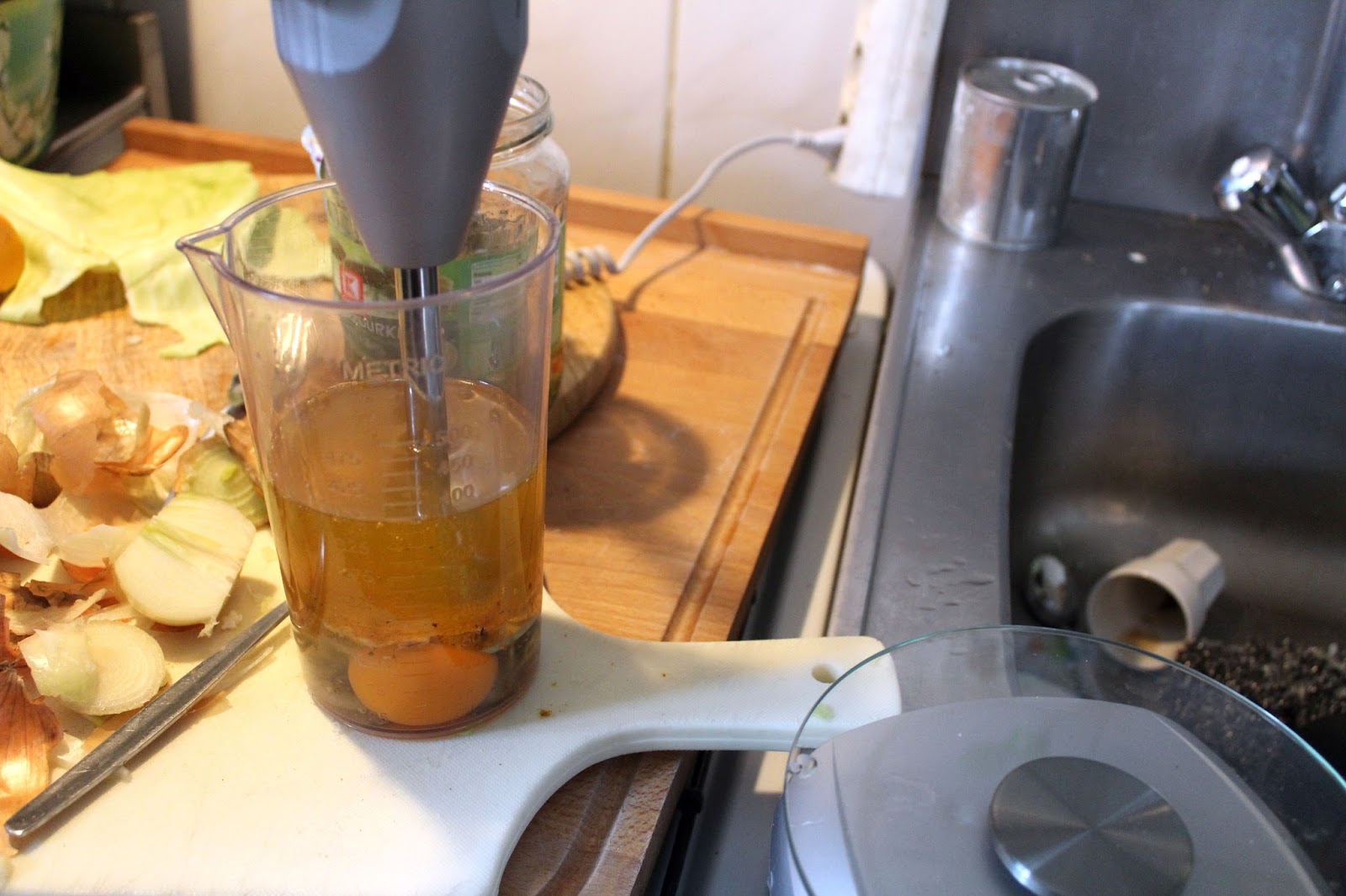 Ohne Zauberstab hätte man nur das Eigelb genommen und würde es jetzt schaumig schlagen. Danach wird dann das Öl in einem dünnen Strahl bei Vollgas in den Becher gegeben, aber immer nur soviel, dass es mit dem Ei emulgieren kann.
