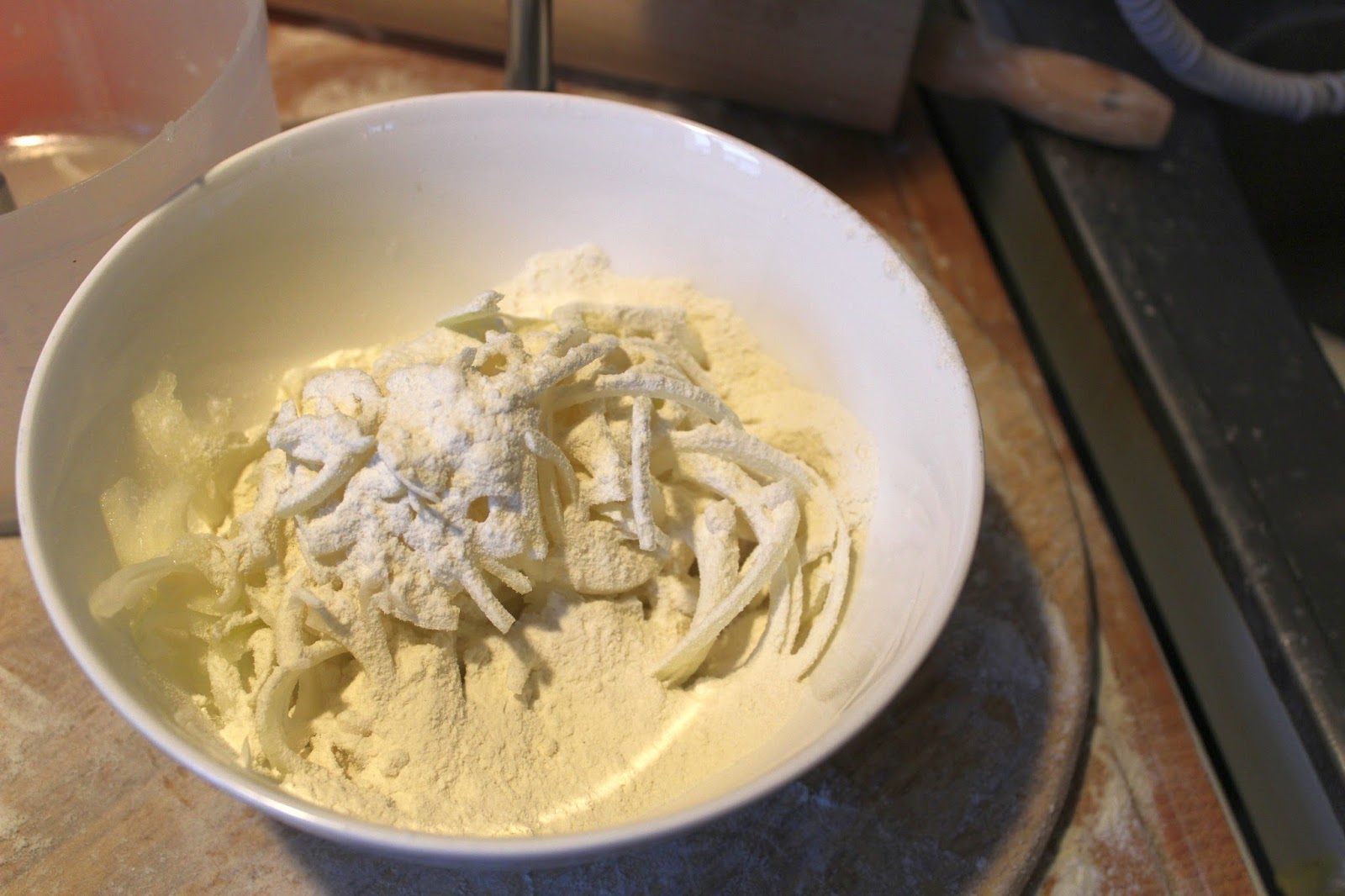 Zwiebeln mit Mehl bestäuben und ordentlich darin wenden.