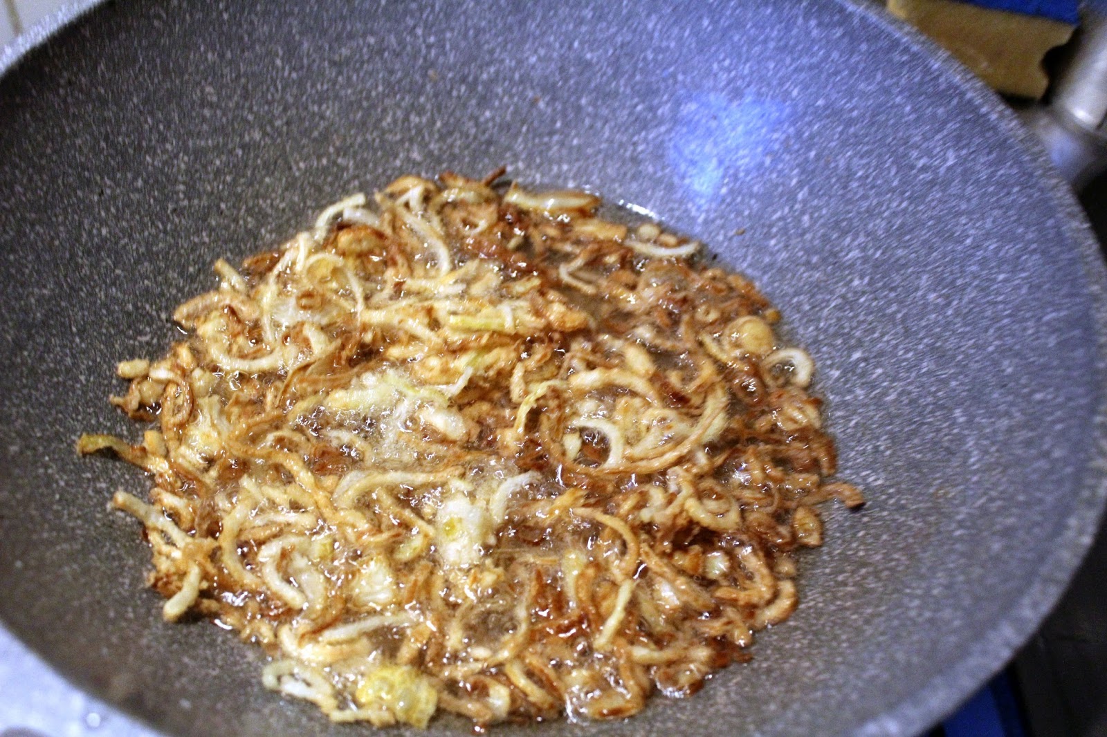 Ihr bestimmt den Bräunungsgrad selbst. Wenn Röstzwiebeln dunkler werden, mit Zucker, Salz und ein wenig Pfeffer aus der Mühle würzen.