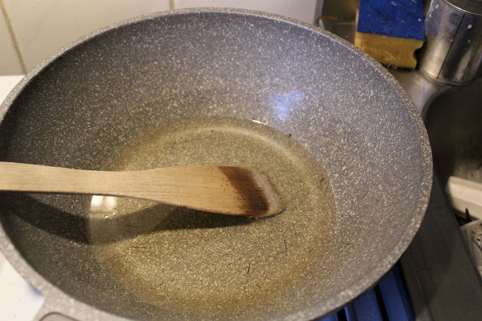Der Pfannenwender aus Holz ist mein Thermometer. Wenn daran die Blasen sprudeln, hat das Fett die richtige Temperatur.