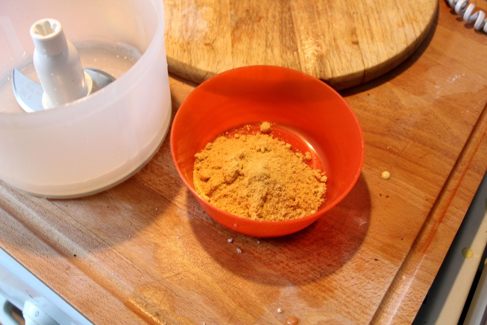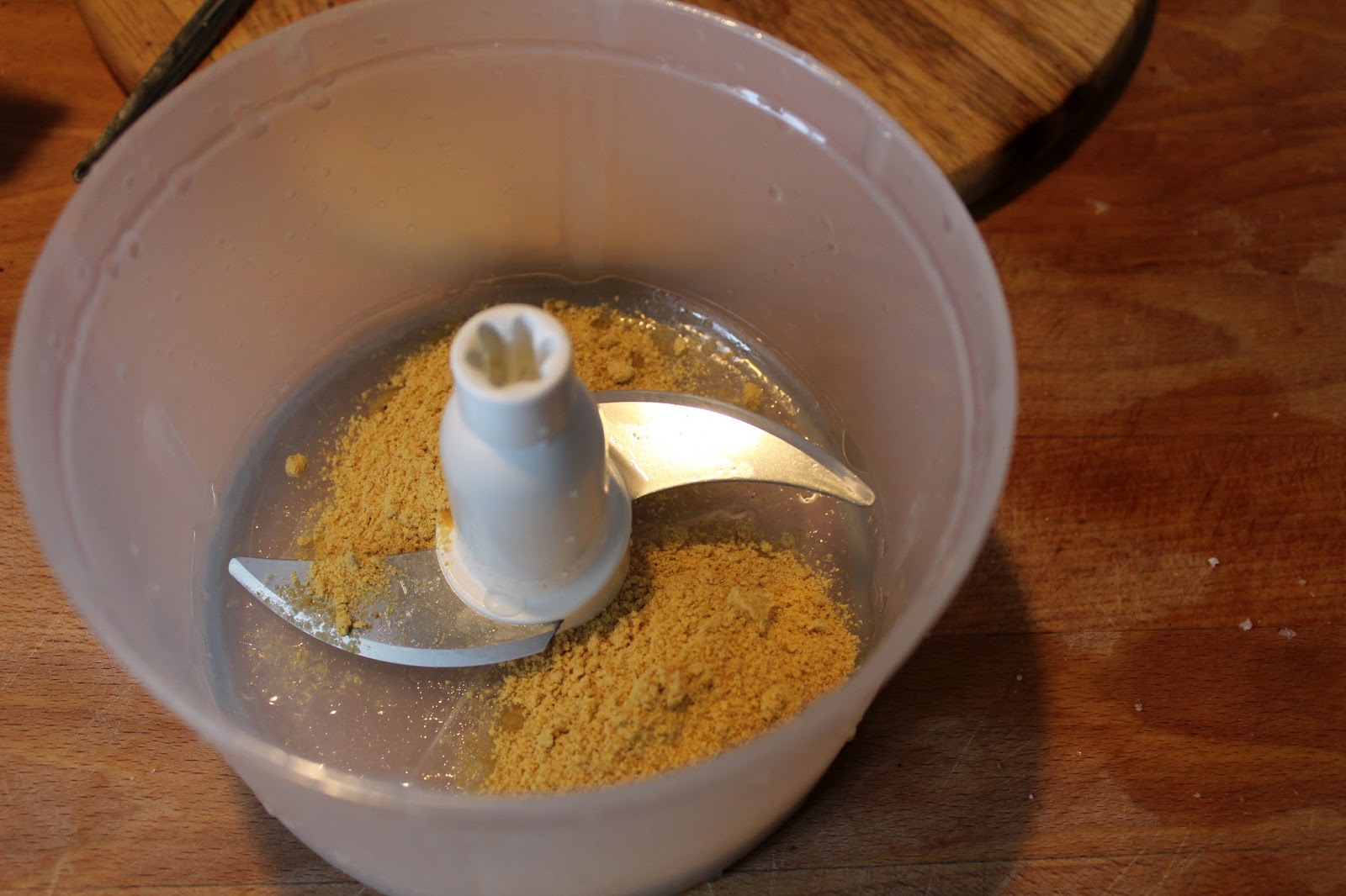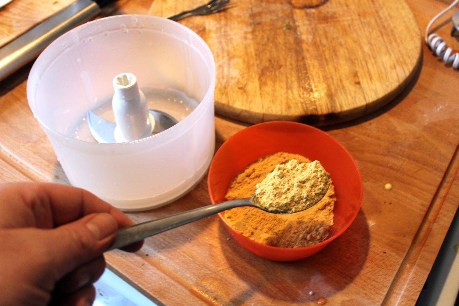 Vier Esslöffel Senfmehl in den Mixbecher füllen