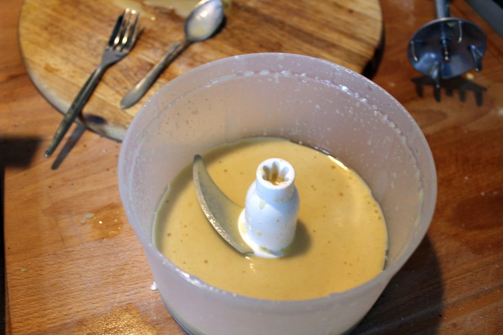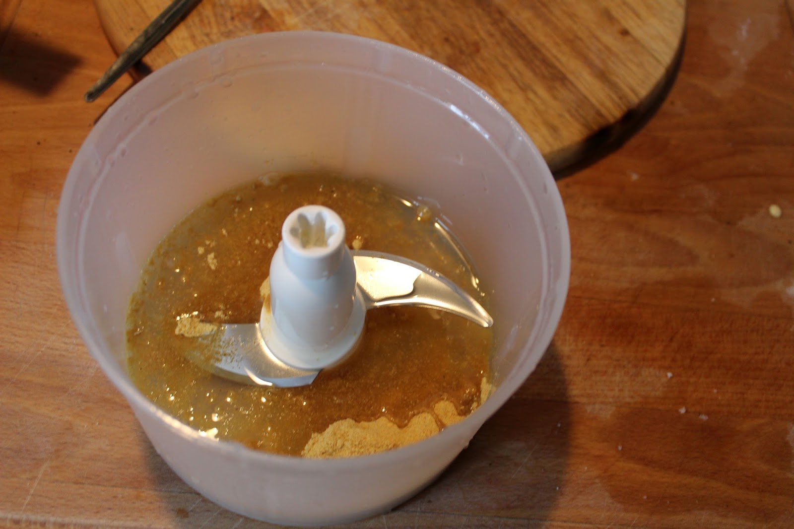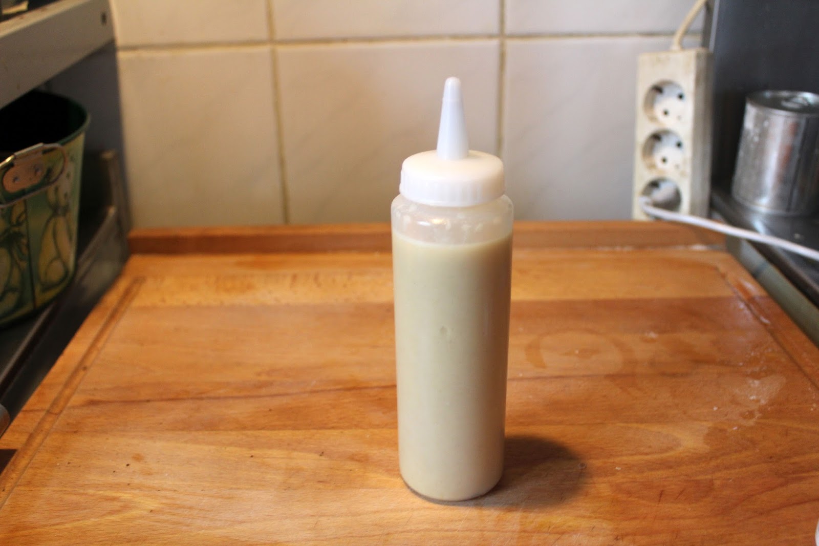 Durch rühren vermischen. Was dann noch fehlt um fließfähig zu sein, mit Wasser auffüllen. Das soll ungefähr so dickflüssig sein wie Bananenmilch, oder Erdbeermilch. Dabei ein bisschen Augenmaß behalten und dran denken, dass das Senfmehl noch ein bisschen anzieht, aber erst nach einem Tag. Gerne noch einmal abschmecken.