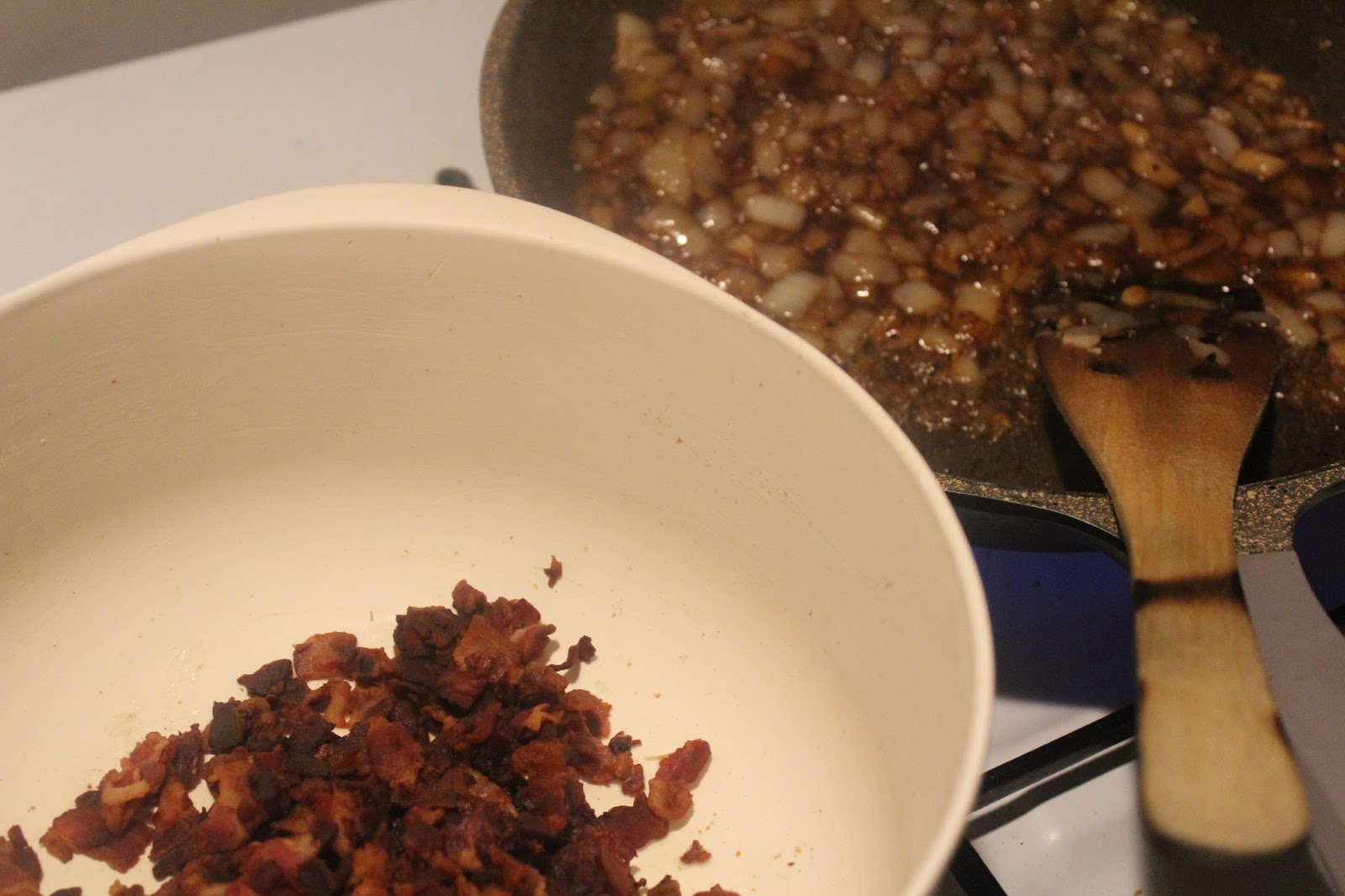 Hier kann man schon ganz gut sehen, wie das Fett aus dem Bacon raus ist und wie der eine schöne Farbe bekommt.
