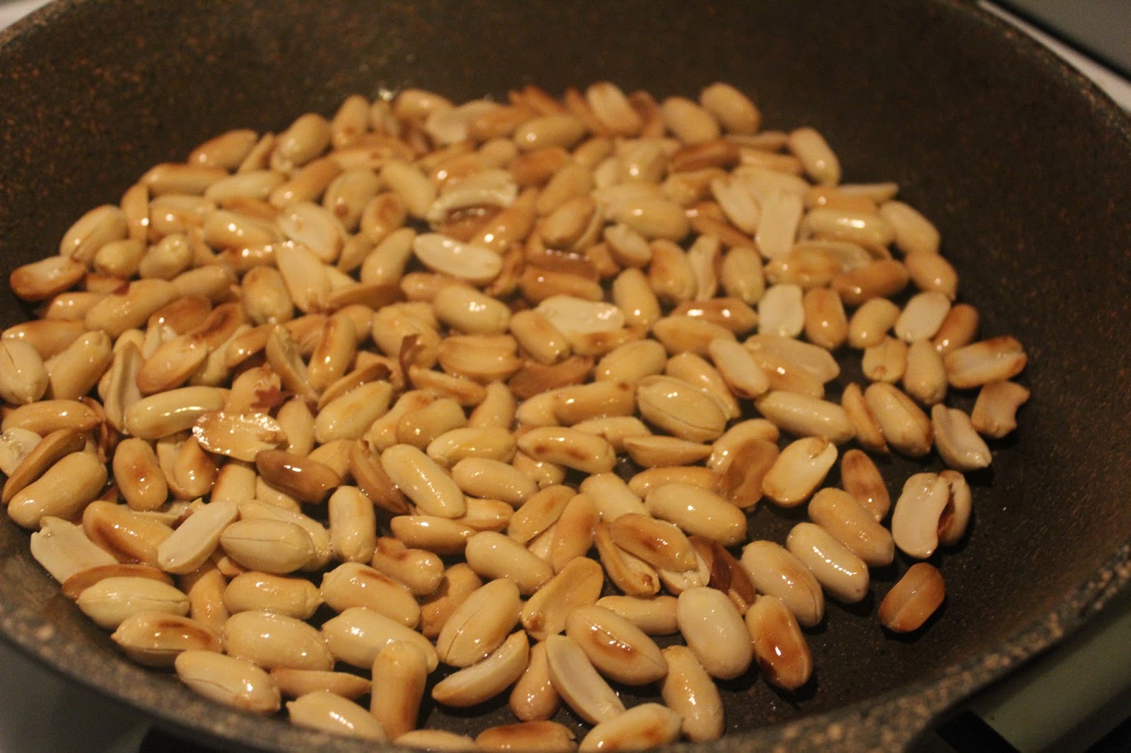 Die Erdnüsse werden dann in der Pfanne geröstet.