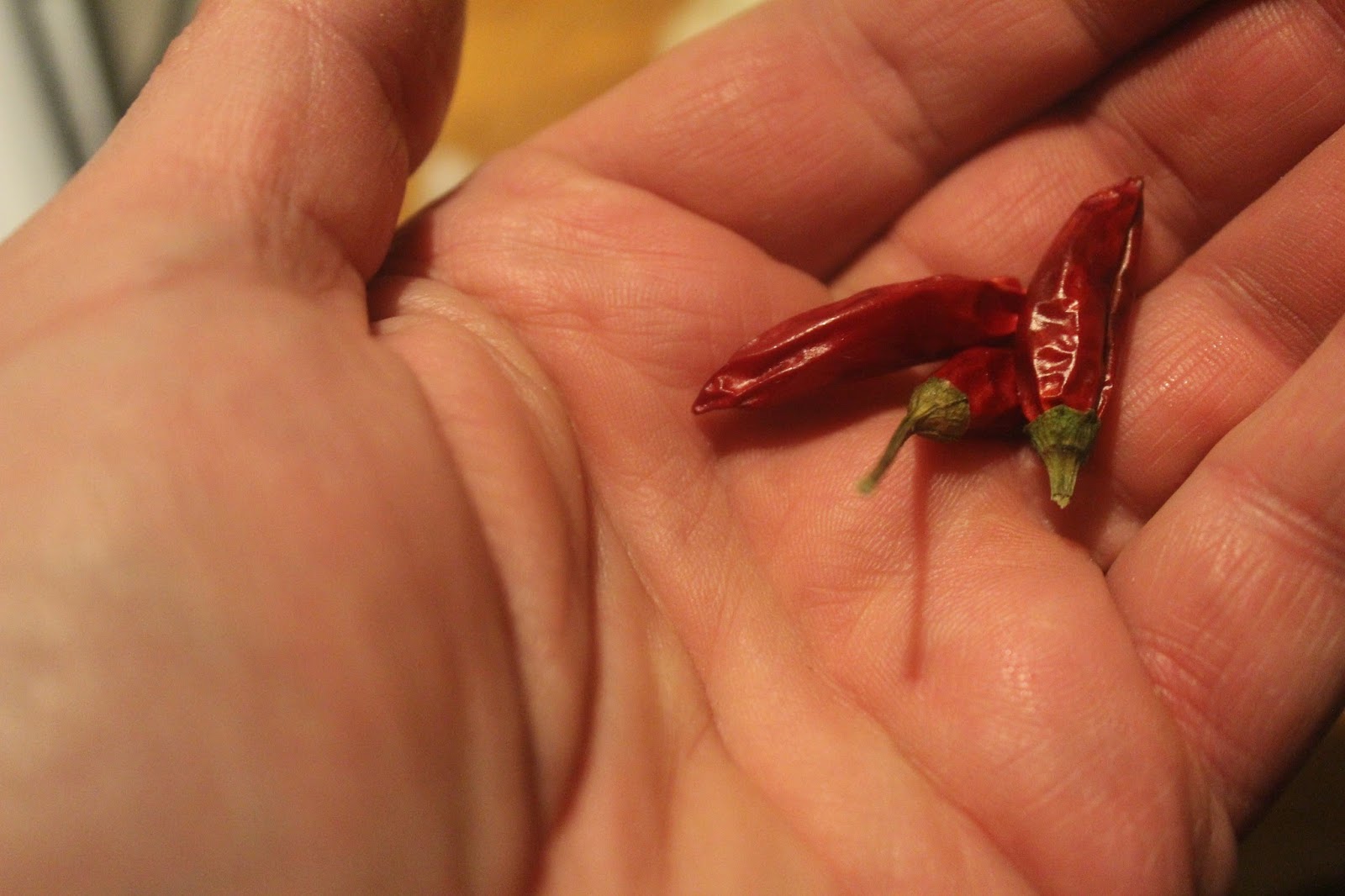 Getrocknete Peperoni für den guten Geschmack. Wie scharf Ihr das wollt, müsst Ihr selbst wissen, aber bei dem ganzen gekauften Kram finde ich das immer ziemlich dünn, was da an Schärfe drin ist. Die drei Stück in meiner Hand, machen schon ganz schön Bums, aber angenehm, nicht dass man Feuer spucken könnte.