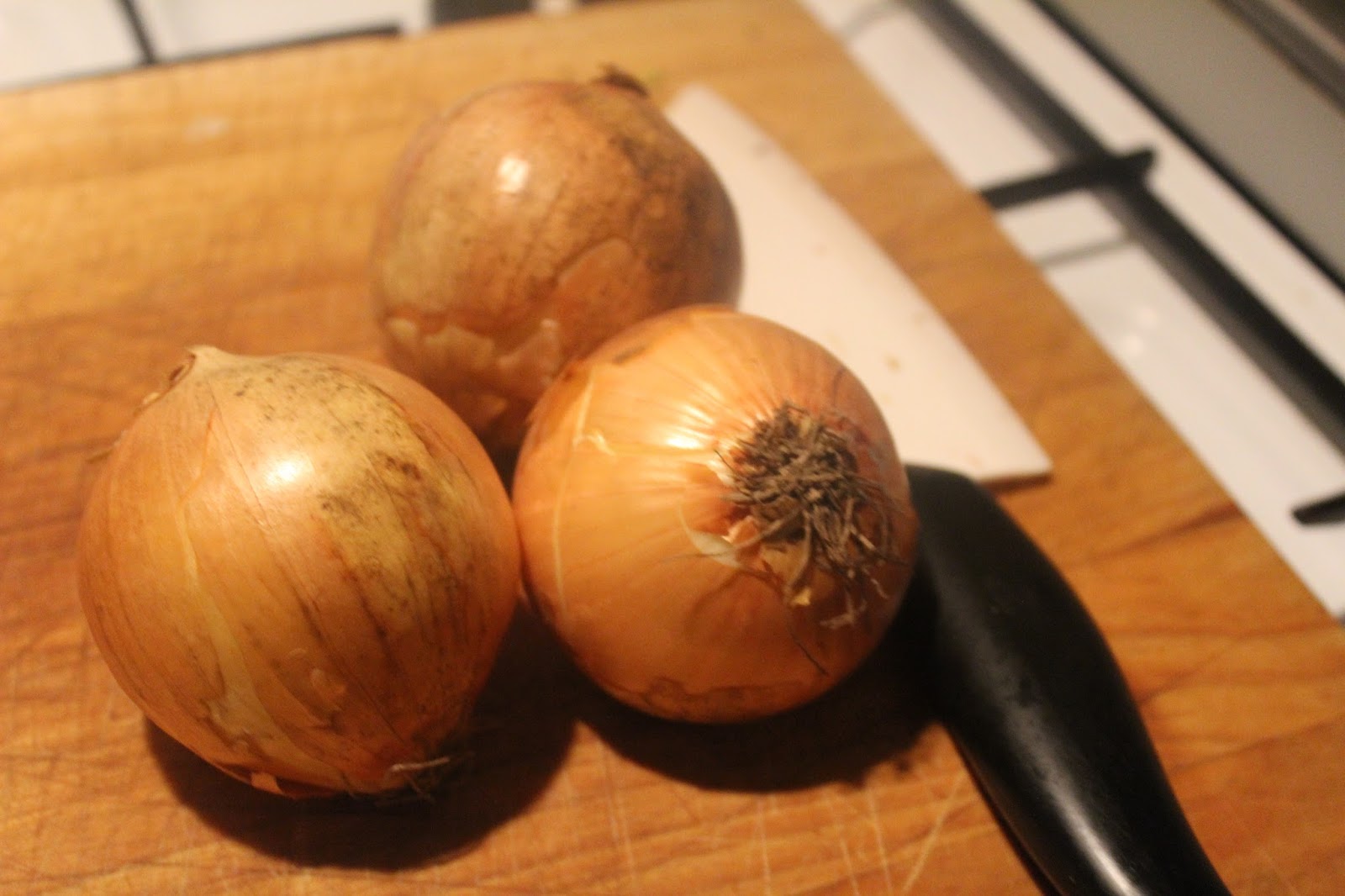 Schnell drei Zwiebeln häuten und zerkleinern. Das kann man natürlich auch vorher schon machen, aber vor mir standen um 21.30 Uhr plötzlich noch drei Gestalten in Schlafanzügen, die zusammen gerade mal 12 Jahre alt sind und sagten, Papa wir wollen noch Steak mit Salat essen. Da musste ich dann kurz unterbrechen, nachdem ich den Bacon aus der Pfanne geholt hatte.