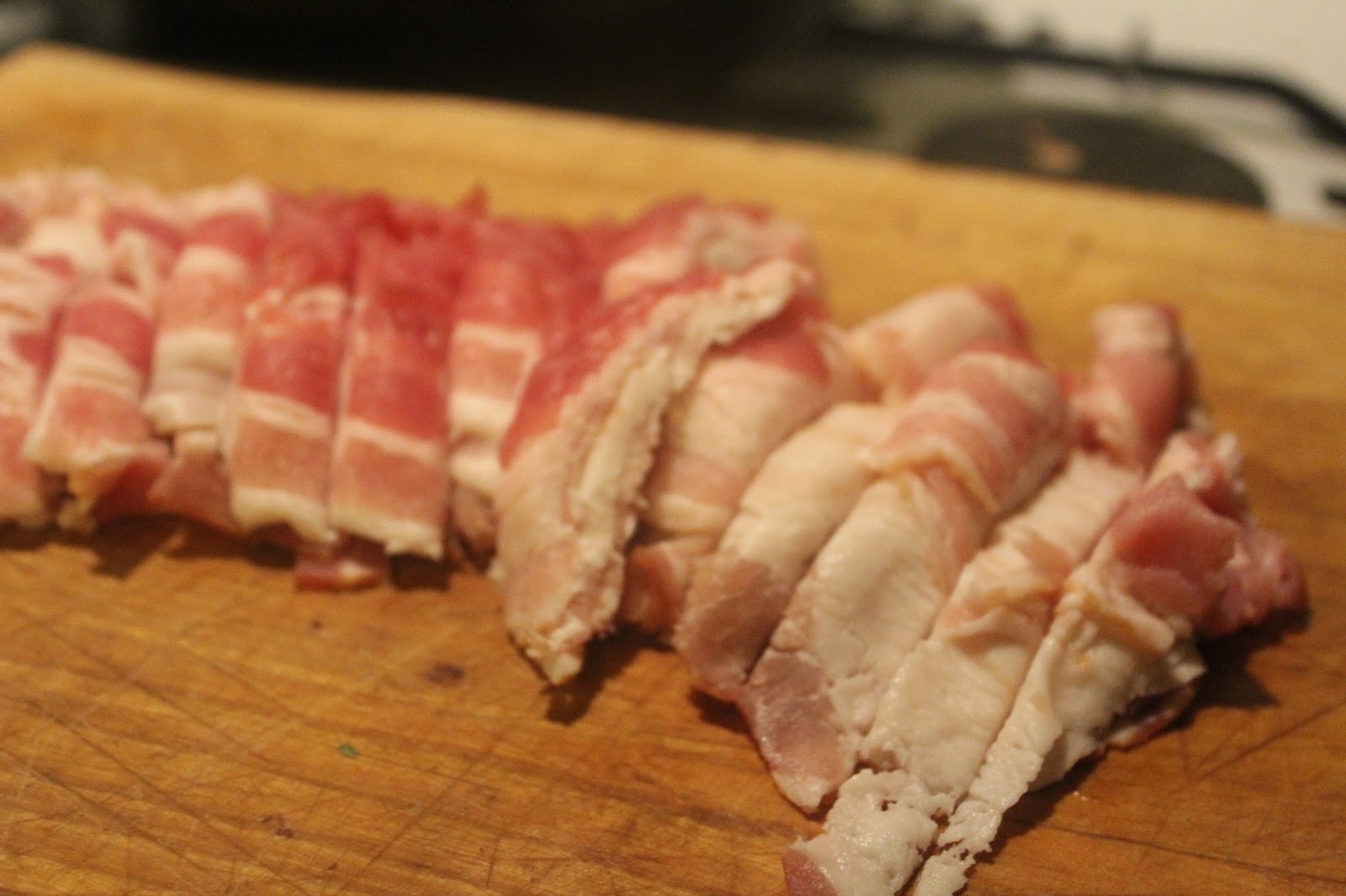 Den Bacon ohne extra Fett, langsam in ca 35 bis 40 Minuten in der Pfanne ausbraten. Dafür darf man nur geringe Hitze benutzen.