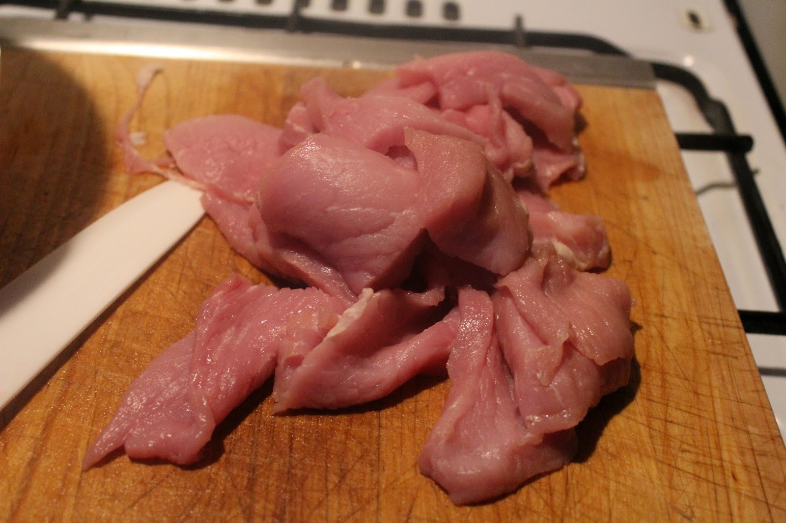 Fleisch in dünne Scheiben schneiden.