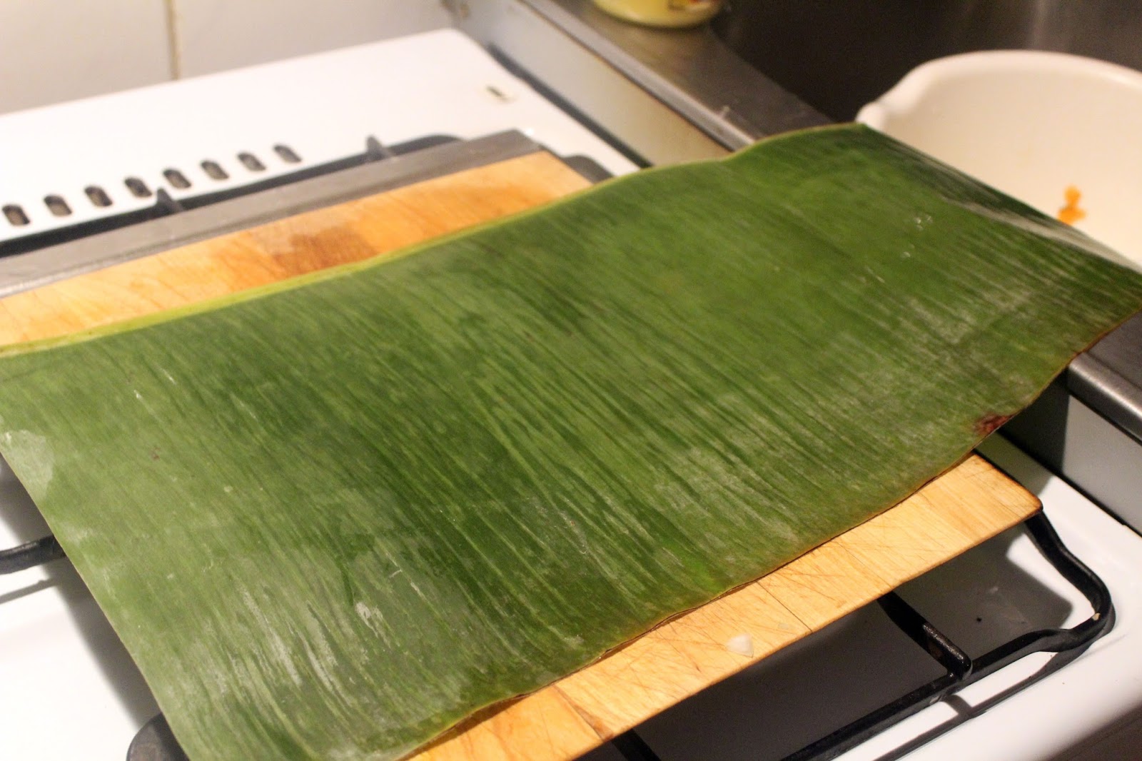 Den Ofen auf 120 Grad vorheizen und dann die Bananenblätter für 30 Minuten in den Ofen stellen. Da jeder Ofen anders funktioniert und ich nur Unterhitze habe, ist das nur ein Richtwert.
